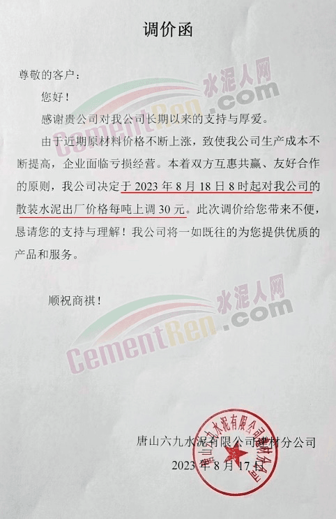 唐山六九水泥有限公司建材分公司通知,由于近期原材料價格不斷上漲,致使公司生產成本不斷提高,企業面臨虧損經營。本著雙方互惠共贏、友好合作的原則,公司決定于2023年8月18日8時起對散裝水泥出廠價格每噸上調30元。