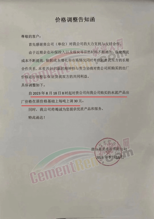 唐山圣龍水泥有限公司通知稱,由于近期企業環保投入以及煤炭等原燃材料不斷增加,致使水泥成本不斷提高。根據成本增長和市場情況,自2023年8月18日8時起,水泥出廠價格在原價格基礎上每噸上調30元。