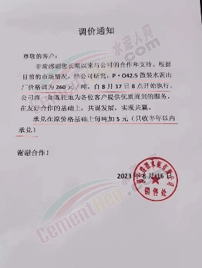 天津市金晟華水泥股份有限公司通知稱,由于市場變化等因素,經公司研究決定自2023年8月17日20:00時起,對PO42.5級水泥出廠價上調30元/噸。