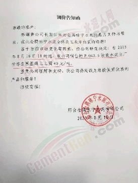 邢臺金隅詠寧水泥有限公司通知,鑒于當前市場變化等因素,經公司研究決定,自2023年8月16日18時起,公司銷售的P.O42.5散裝水泥出廠價格在原基礎上上調40元/噸。