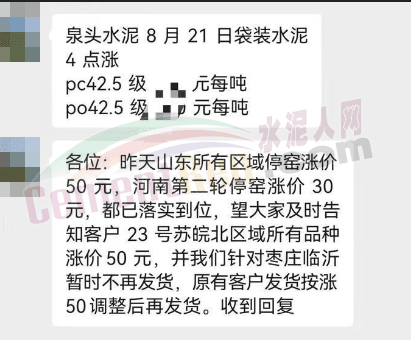 據(jù)市場反饋,8月20日棗莊中聯(lián)、華沃已上調(diào)報價30元/噸;21日濟(jì)寧海螺上調(diào)30元/噸。22日-23日蘇北徐州中聯(lián)水泥、龍山水泥將上調(diào)報價。江蘇徐州一經(jīng)銷商通知稱,水泥又要漲價了,有建房子要快下手了,預(yù)計上漲30~50元/噸。