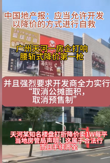 日前,廣州天河一知名樓盤打折降價賣1W每平,打響“腰斬式”降價第一槍。并且強烈要求開發商全力實行取消公攤面積,取消預售制。當地房管局聲明稱,這屬于合法行為,手續齊全。