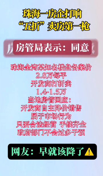 同期,珠海金灣某知名樓盤備案價2.8萬,每平開發商打折賣1.4萬~1.5萬。當地房管回應稱,開發商自主降價銷售屬于市場行為,只要合法經營手續齊全政府部門不會過多干預。