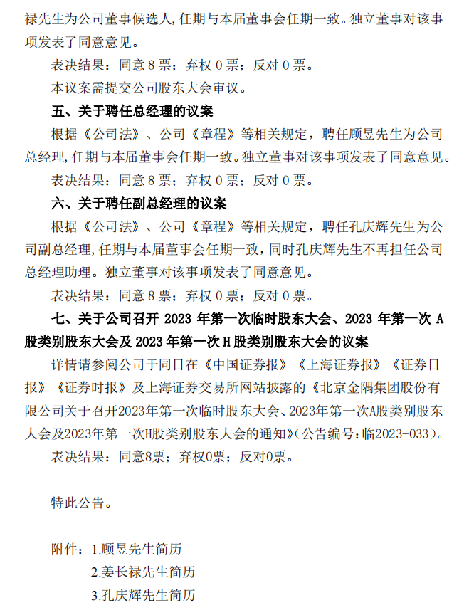 同期選舉劉燕先生擔任公司第八屆董事會董事長。同意調整劉燕先生為公司董事會環境、社會及管治(ESG)委員會、戰略委員會主任委員。同期聘任何小龍先生為公司副總裁。