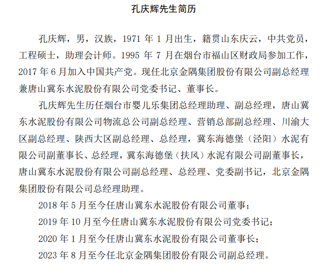 金隅冀東24日晚間公告,提名顧昱先生、姜長祿先生為公司董事候選人。聘任顧昱先生為公司總經理,聘任孔慶輝先生為公司副總經理,任期與本屆董事會任期一致,同時孔慶輝先生不再擔任公司總經理助理。