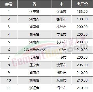 水泥人網信息數據顯示,8月中下旬,全國PO42.5散裝水泥價格最低的前10個地區為遼陽市、衡陽市、株洲市、益陽市、長沙市、中衛市、玉溪市、沈陽市、湘潭市、永州市、紹興市,P.O42.5散裝水泥出廠報價均在210元/噸以下。前十地區中,僅湖南省就占了6個地區。