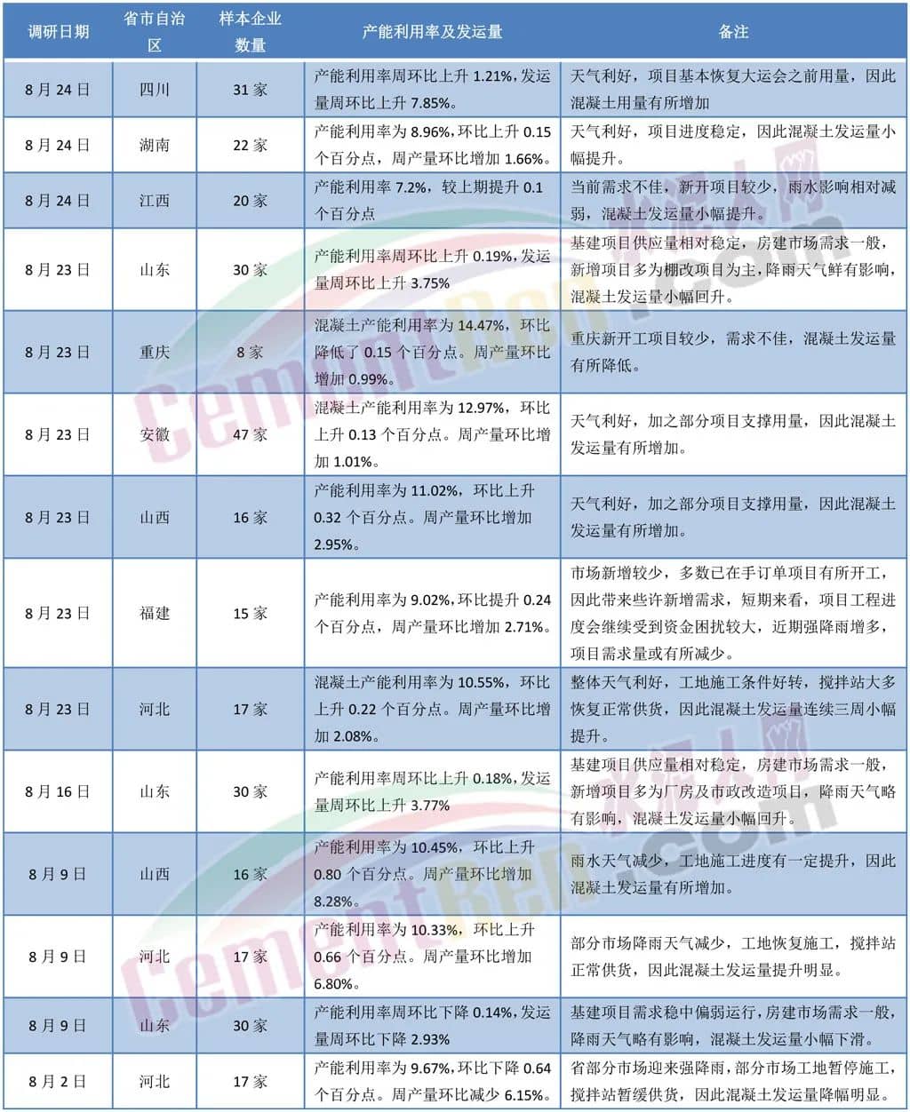 同期,下游商混企業被迫跟進下調報價,進入8月份以來廣東、山東、安徽、江蘇、浙江等多個區域商品混凝土報價下跌。其中山東區域下跌2-3輪,累計下跌10-25元/方;廣東多地混凝土價格下跌5-20元/方;其他區域多為5-15元/方不等的下跌。