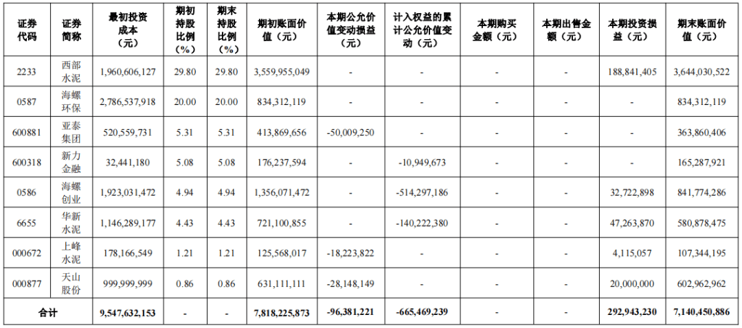 作為水泥行業的“股神”,海螺水泥在上半年繼續持有同行西部水泥、亞泰集團、華新水泥、上峰水泥、天山股份等企業的股份。截至2023年6月末,海螺水泥持有其他上市公司股份情況如下: