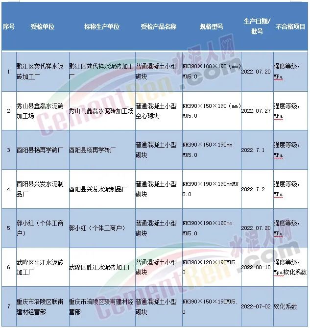 今年8月15日重慶市市場監督管理局發布的通告文件顯示,抽查涉及黔江區、彭水縣、酉陽縣、秀山縣、涪陵區、武隆區、石柱縣等7個區縣的48批次普通混凝土小型砌塊產品中,發現7批次產品不合格。不合格項目涉及軟化系數、強度等級,不合格率達14.58%。