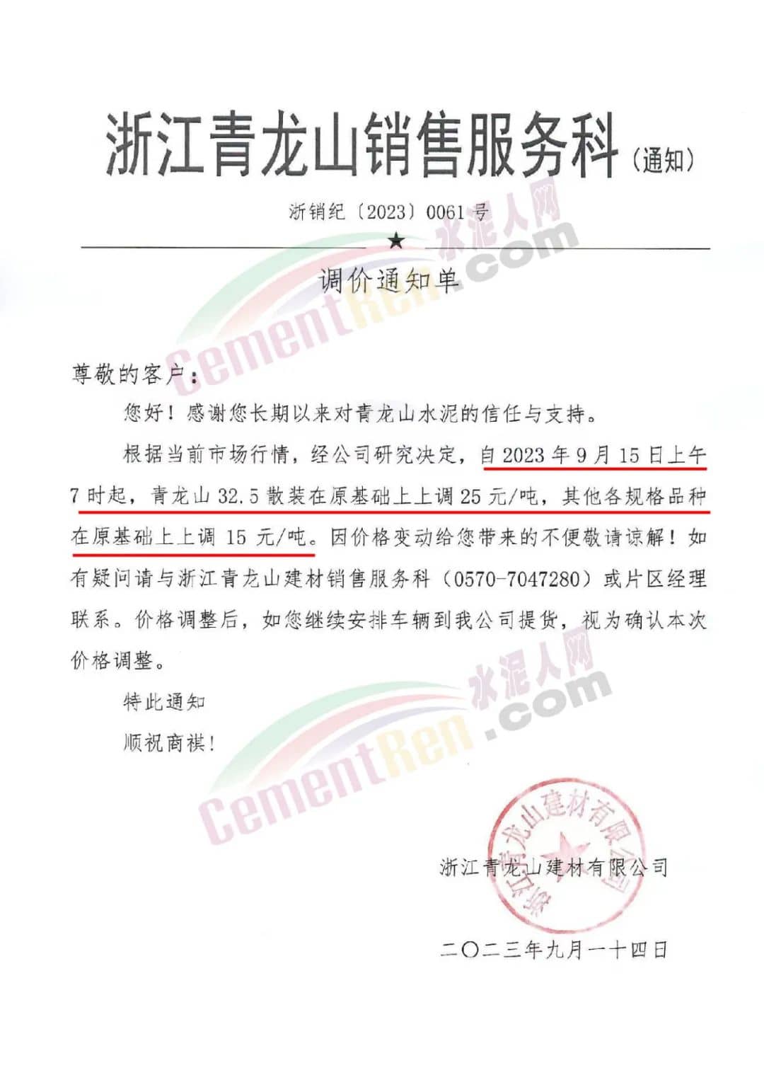 同期,紅獅水泥旗下浙江青龍山銷售服務(wù)科通知,根據(jù)當(dāng)前市場(chǎng)行情,經(jīng)公司研究決定,自2023年9月15日上午7時(shí)起,青龍山32.5散裝在原基礎(chǔ)上上調(diào)25元/噸,其他各規(guī)格品種在原基礎(chǔ)上上調(diào)15元/噸。