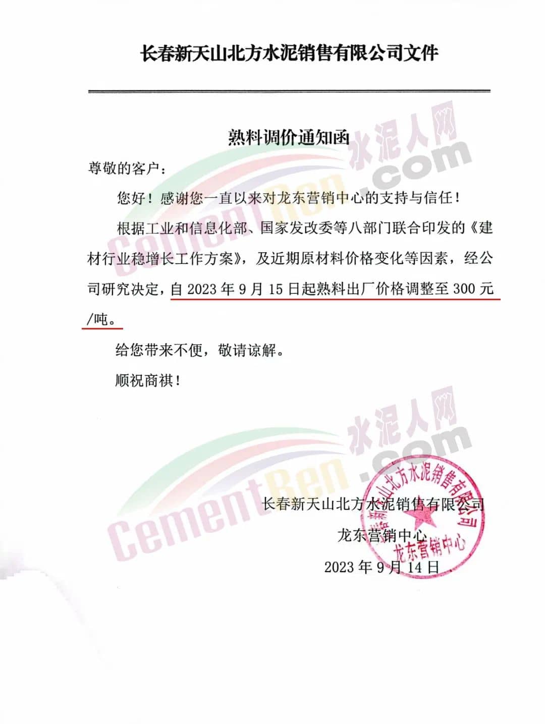 長(zhǎng)春新天山北方水泥銷售有限公司通知,自2023年9月15日起熟料出廠價(jià)格調(diào)整至300元/噸。