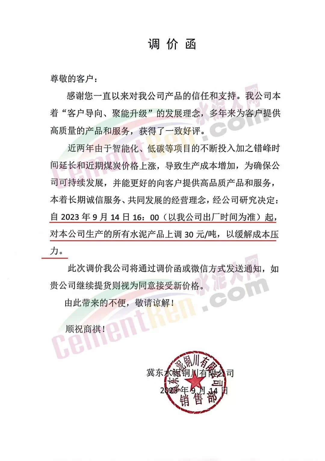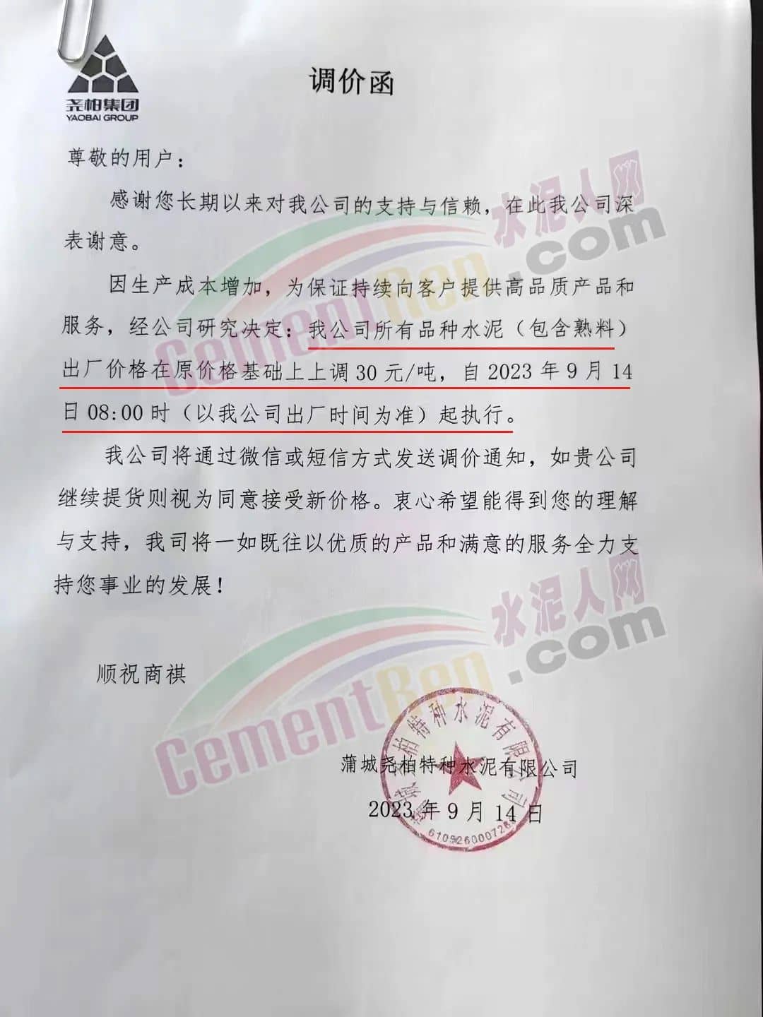 蒲城堯柏水泥通知,因生產(chǎn)成本增加,為保證持續(xù)向客戶提供高品質(zhì)產(chǎn)品和服務(wù),經(jīng)公司研究決定,所有品種水泥 (包含熟料)出廠價(jià)格在原價(jià)格基礎(chǔ)上上調(diào)30元/噸,自2023 年9月14日8時(shí)起執(zhí)行。