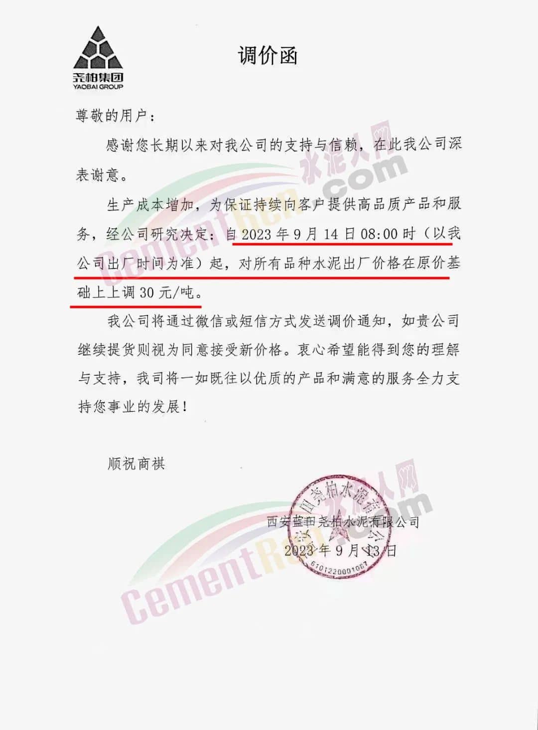 西安藍(lán)堯柏水泥有限公司通知,生產(chǎn)成本增加,為保證持續(xù)向客戶提供高品質(zhì)產(chǎn)品和服務(wù),經(jīng)公司研究決定,自2023年9月14日8時(shí)起,對(duì)所有品種水泥出廠價(jià)格在原價(jià)基礎(chǔ)上上調(diào)30元/噸。