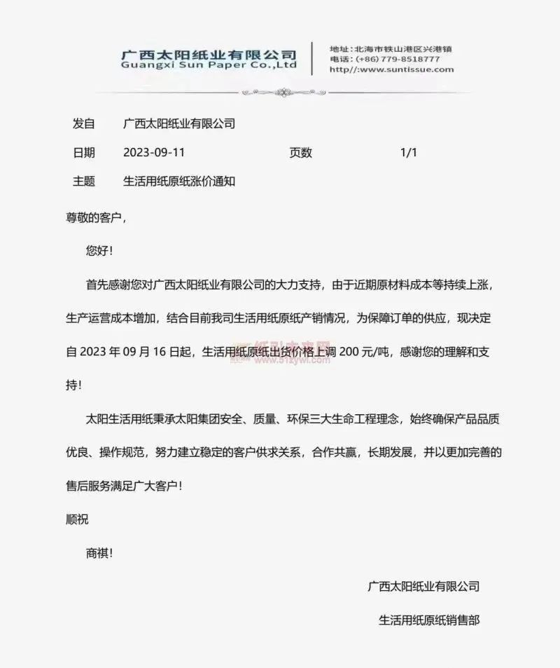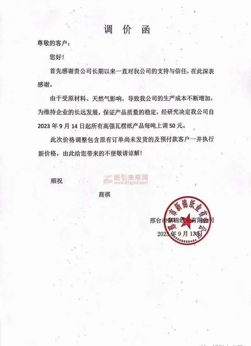臺(tái)市新錦紙業(yè)、棗莊市恒宇紙業(yè)、浙江華天再生資源、江蘇富星紙業(yè)、 山東豐源中盛紙業(yè)、江蘇金田紙業(yè)、山東豐碩紙業(yè)、浙江明路控股集團(tuán)、河南匯祥再生資源科技、四川華僑鳳凰紙業(yè)等宣布產(chǎn)品每噸上調(diào)50元。