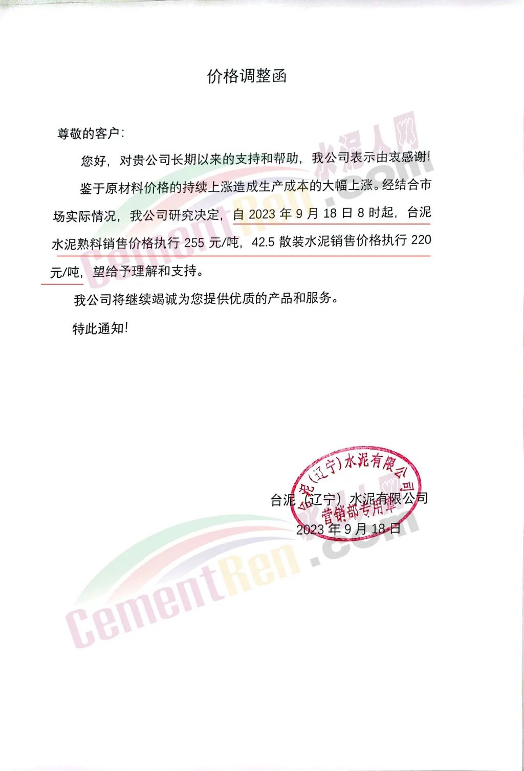 臺泥(遼寧)水泥有限公司通知,鑒于原材料價格的持續(xù)上漲造成生產(chǎn)成本的大幅上漲。經(jīng)結(jié)合市場實際情況,公司研究決定,自2023年9月18日8時起,臺泥水泥熟料銷售價格執(zhí)行255元/噸,42.5散裝水泥銷售價格執(zhí)行220元/噸。