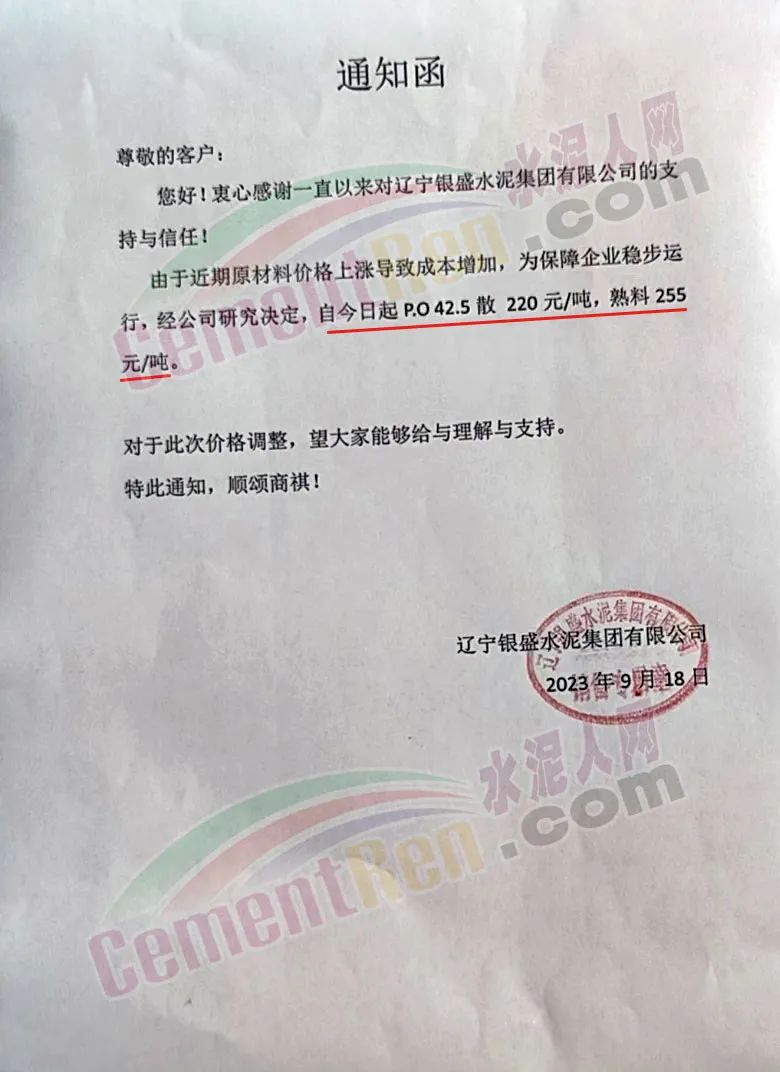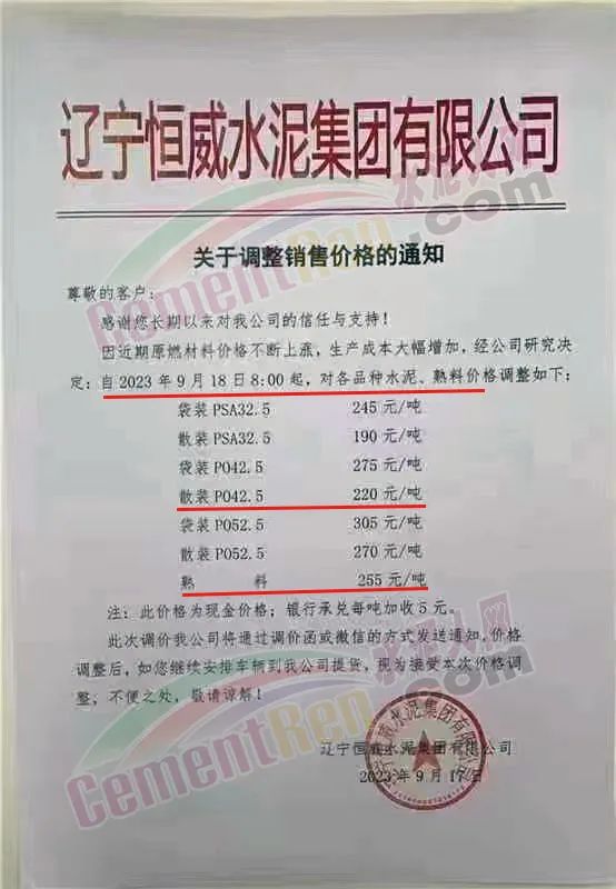 遼寧恒威水泥集團有限公司通知,因近期原燃材料價格不斷上漲,生產(chǎn)成本大幅增加,經(jīng)公司研究決定:自2023年9月18日8:00起,對各品種水泥、熟料價格調(diào)整。調(diào)整后熟料報價255元/噸,散裝P.O42.5水泥報價220元/噸。