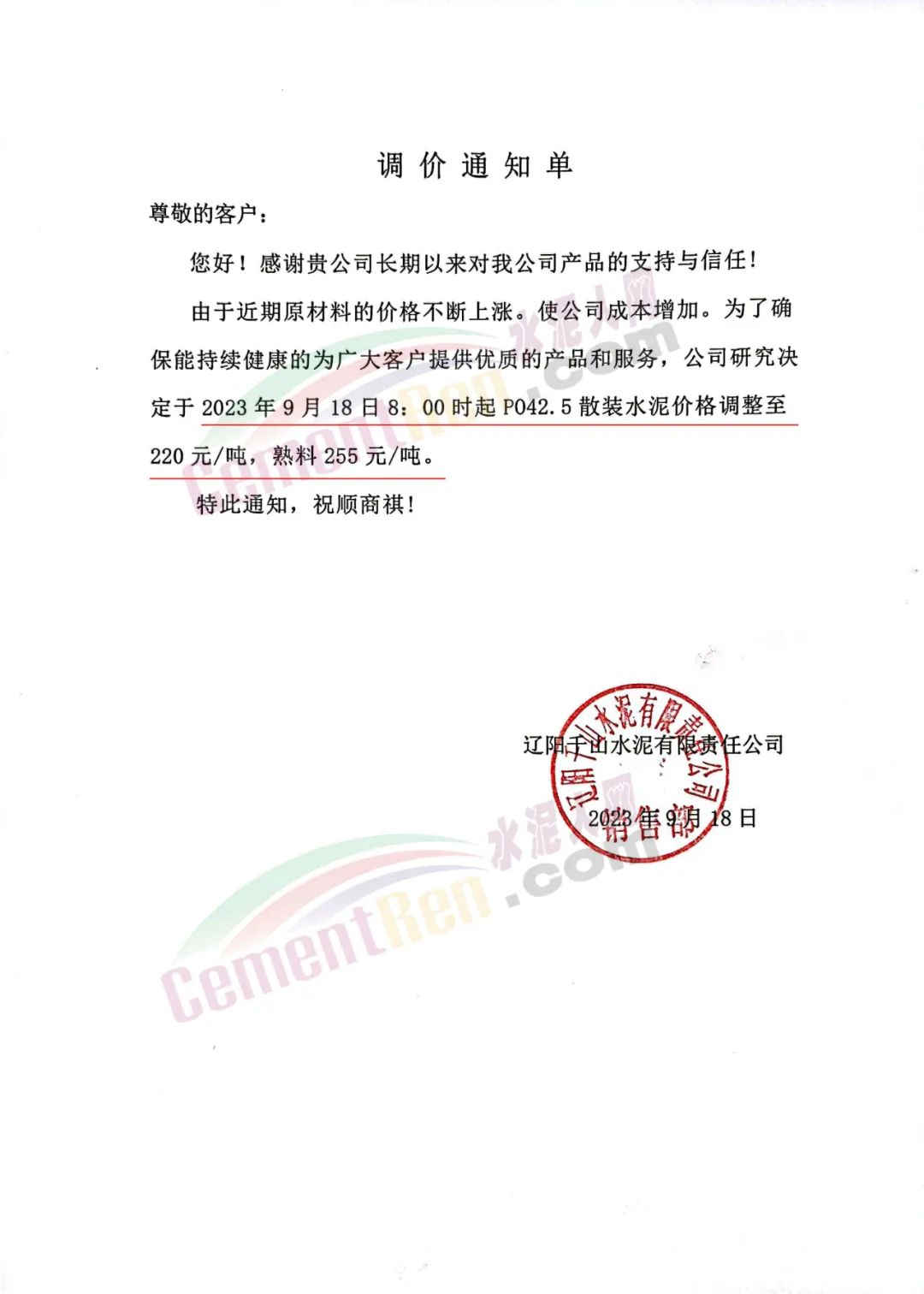遼陽千山水泥有限責任公司通知,由于近期原材料的價格不斷上漲。使公司成本增加。為了確保能持續(xù)健康的為廣大客戶提供優(yōu)質(zhì)的產(chǎn)品和服務,公司研究決定于2023年9月18日8:00時起PO425散裝水泥價格調(diào)整至220元/噸,熟料255元/噸。