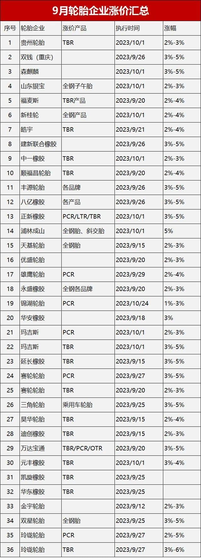 近期,40多家輪胎企業(yè)發(fā)布漲價通知,其中有針對全鋼胎的,也有針對半鋼胎的。正新、瑪吉斯、賽輪、玲瓏等企業(yè)更是先后發(fā)布多張漲價通知,對多品牌、多品類產(chǎn)品漲價,漲幅在3%-5%左右。