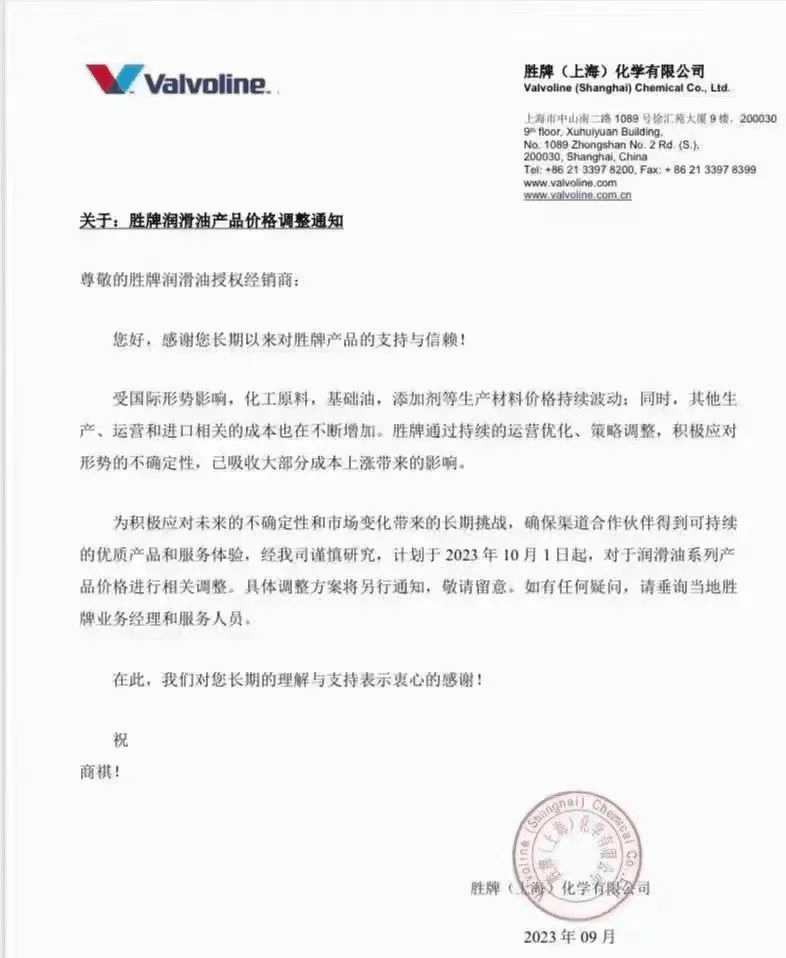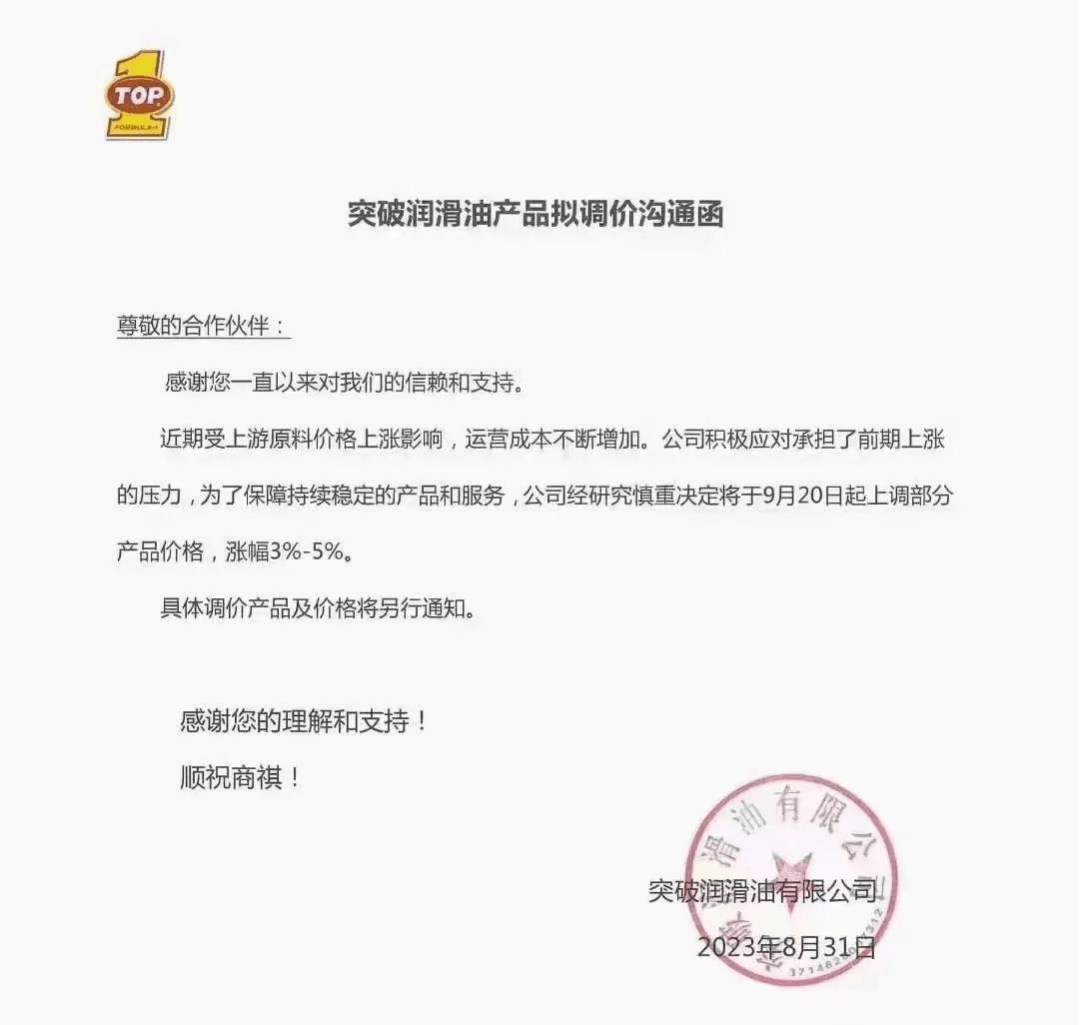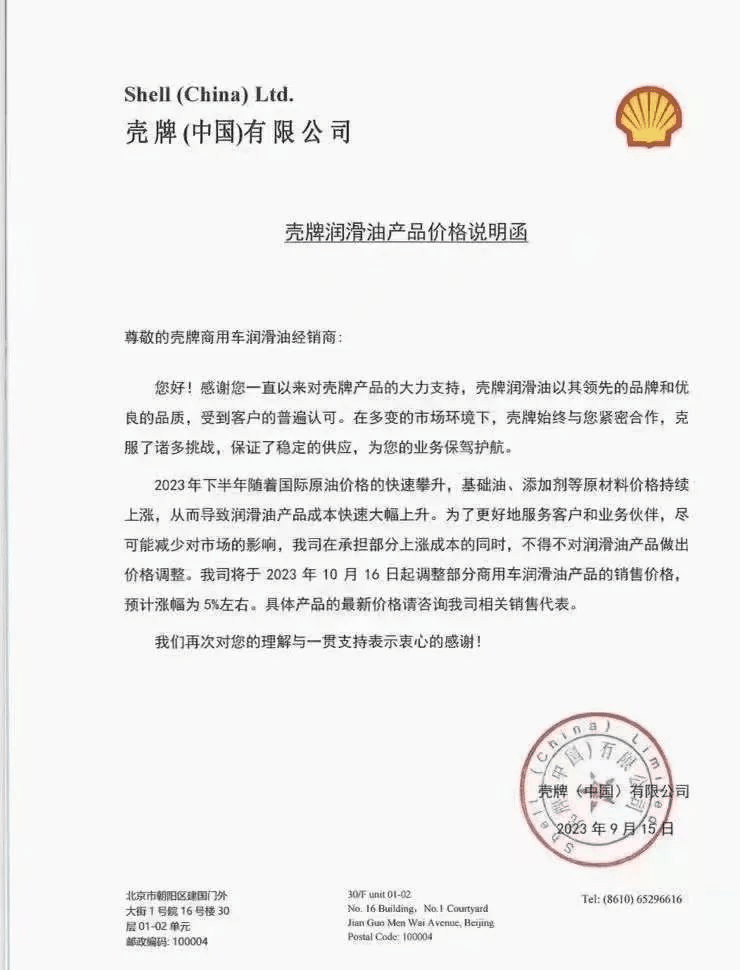 近日,勝牌、殼牌和突破潤滑油發(fā)布了關(guān)于調(diào)整潤滑油產(chǎn)品價格通告,宣布對產(chǎn)品價格進行適度上調(diào),預計漲幅為5%左右。