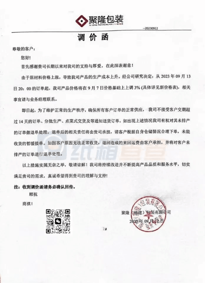 聚隆(福建)包裝:從2023年9月13日20:00的訂單起,將在9月7日價格基礎上上調(diào)3%。
