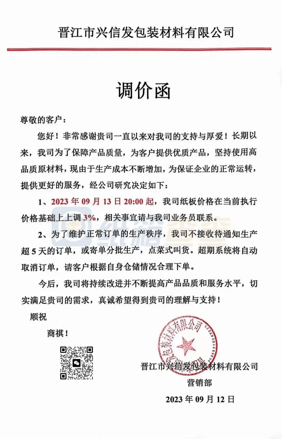 晉江市興信發(fā)包裝材料:從2023年9月13日20:00起,紙板價格在當前執(zhí)行價格基礎上上調(diào)3%。