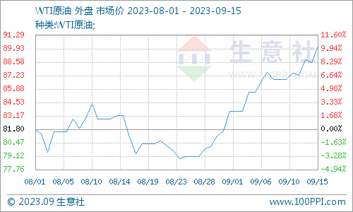 沙特持續(xù)減產(chǎn),今年第四季度全球石油市場將面臨每天超過300萬桶的供應缺口,9月14日,國際原油期貨上漲,漲幅明顯。美國WTI原油期貨主力合約結(jié)算價報90.16美元/桶,漲幅1.64美元或1.9%。今年WTI首次站上90美元關(guān)口,創(chuàng)2022年11月以來新高。8月23日以來,WTI原油價格階段性大漲14.4%。