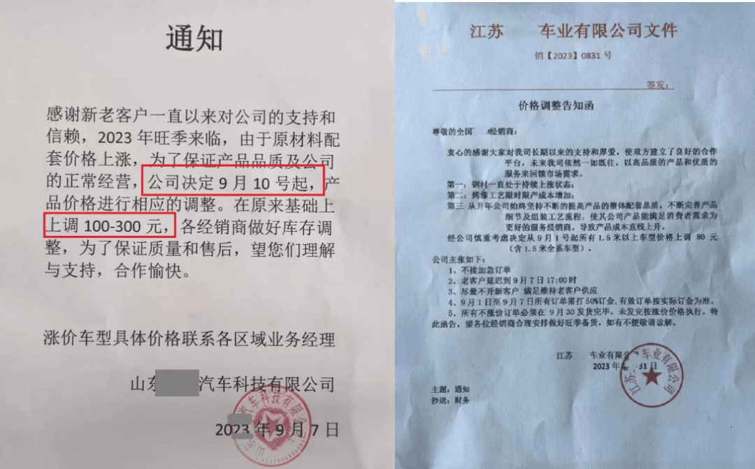 多個整車廠家自9月10日起,在8月份上調(diào)基礎上價格再次上調(diào),兩輪車、三輪車、四輪車或?qū)⒂瓉韼资綆装僭坏鹊臐q價幅度,各三輪車、篷車、微電轎車型漲價幅度在120——300元不等,目前漲價潮已蔓延至全國市場。