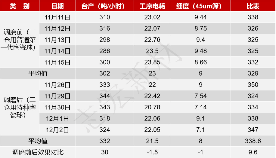 2#水泥磨粉磨工序調(diào)磨前后統(tǒng)計(jì)數(shù)據(jù)及對(duì)比