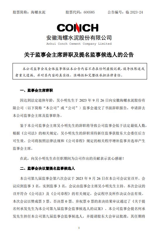 海螺水泥公告稱,因達到法定退休年齡,吳小明先生于2023年9月26日向安徽海螺水泥股份有限公司監事會遞交了書面辭職報告,申請辭去本公司監事會主席及監事職務。