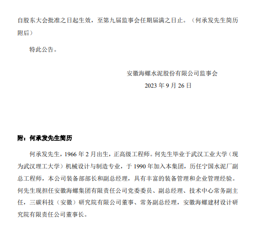 海螺水泥:監事會主席吳小明辭職,何承發接任
