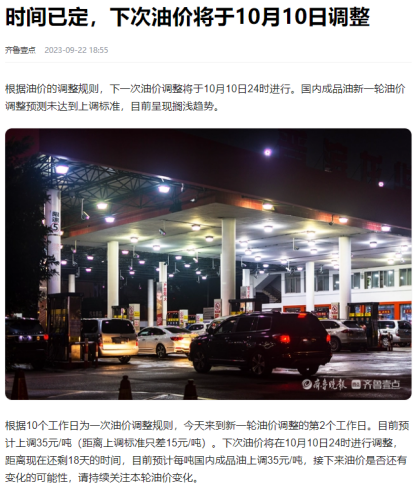 近來有消息稱,下一輪油價將于10月10日進行調整。根據10個工作日為一次油價調整規則,目前預計上調35元/噸(距離上調標準只差15元/噸)。下次油價將在10月10日24時進行調整。距離現在還剩10幾天的時間,目前預計每噸國內成品油上調35元/噸。