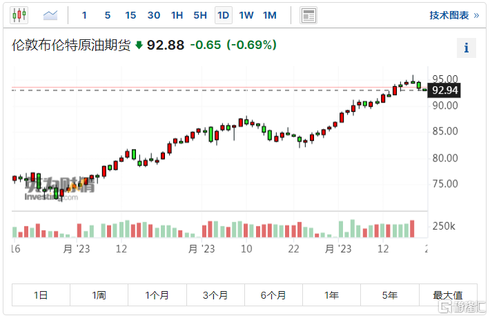 由于沙特阿拉伯和俄羅斯分別宣布延續減產減供措施,國際石油庫存走低推升了供不應求的焦慮心態。近期國際油價盤中一度創下10個月以來新高,美油一度漲至93美元/桶,布油也一度突破95美元/桶。自今年6月以來,布倫特原油價格累計上漲超28%。