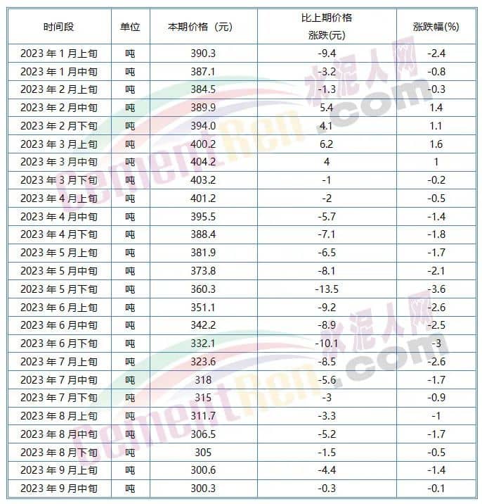 從近期國家統計局公布的數據可見,流通領域水泥價格連續下跌已放緩。流通區域普通硅酸鹽水泥(P.O42.5散裝)9月中旬報價300.3元/噸,為年內最低價。且從3月下旬開始連續18期下跌,從5月上旬開始連續14期創年內低點。較本年高點404.2元/噸,相差103.9元/噸。可喜的是近期跌幅收窄至0.1%,為年內最低跌幅,這也意味著即將回升的趨勢。