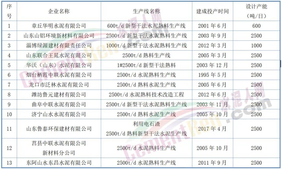 據(jù)了解,截至2022年12月31日山東省內(nèi)共有85條熟料生產(chǎn)線(xiàn),其中2500t/d及以下生產(chǎn)線(xiàn)13條,包含山東魯泰環(huán)保建材有限公司一條利用電石渣2500t/d熟料新型干法水泥生產(chǎn)線(xiàn)。