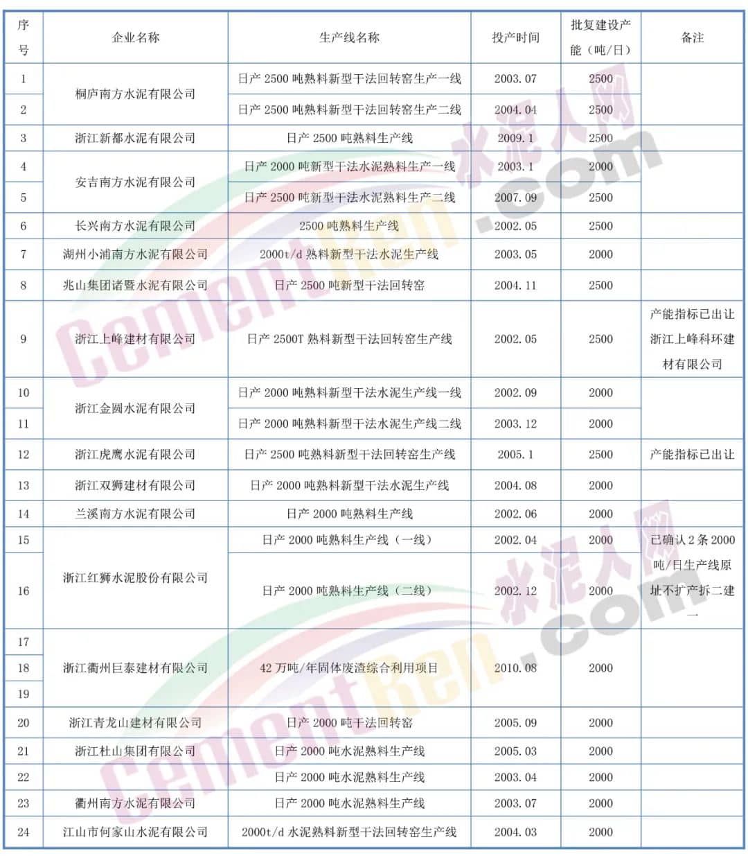 浙江紅獅水泥股份有限公司已確認(rèn)兩條2000t/d生產(chǎn)線(xiàn)原址不擴(kuò)產(chǎn)拆二建一;浙江上峰建材有限公司日產(chǎn)2500噸熟料新型干法回轉(zhuǎn)窯生產(chǎn)線(xiàn)產(chǎn)能指標(biāo)已出讓浙江上峰科環(huán)建材有限公司;浙江虎鷹水泥有限公司,日產(chǎn)2500噸熟料新型干法回轉(zhuǎn)窯生產(chǎn)線(xiàn)產(chǎn)能指標(biāo)已出讓。