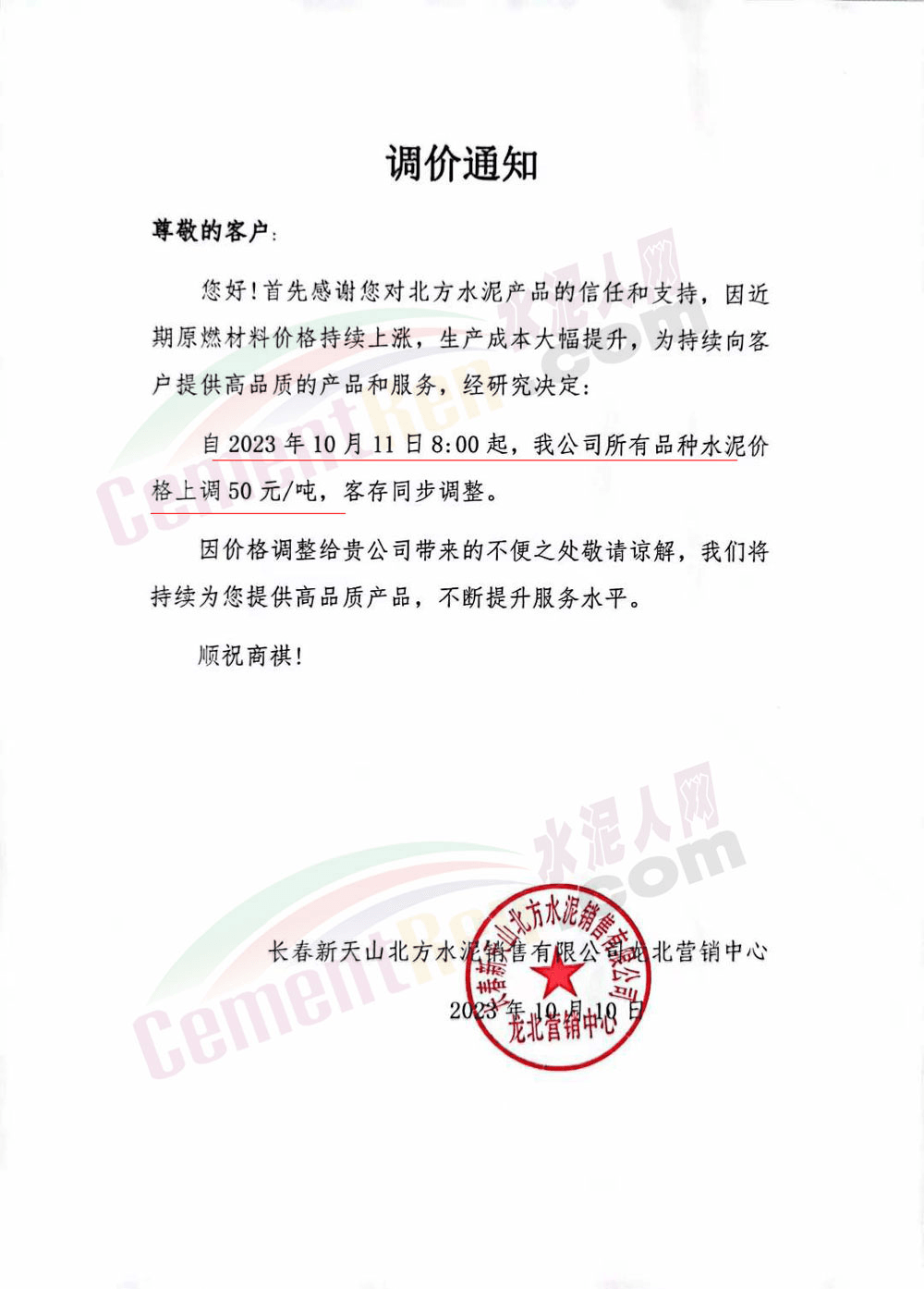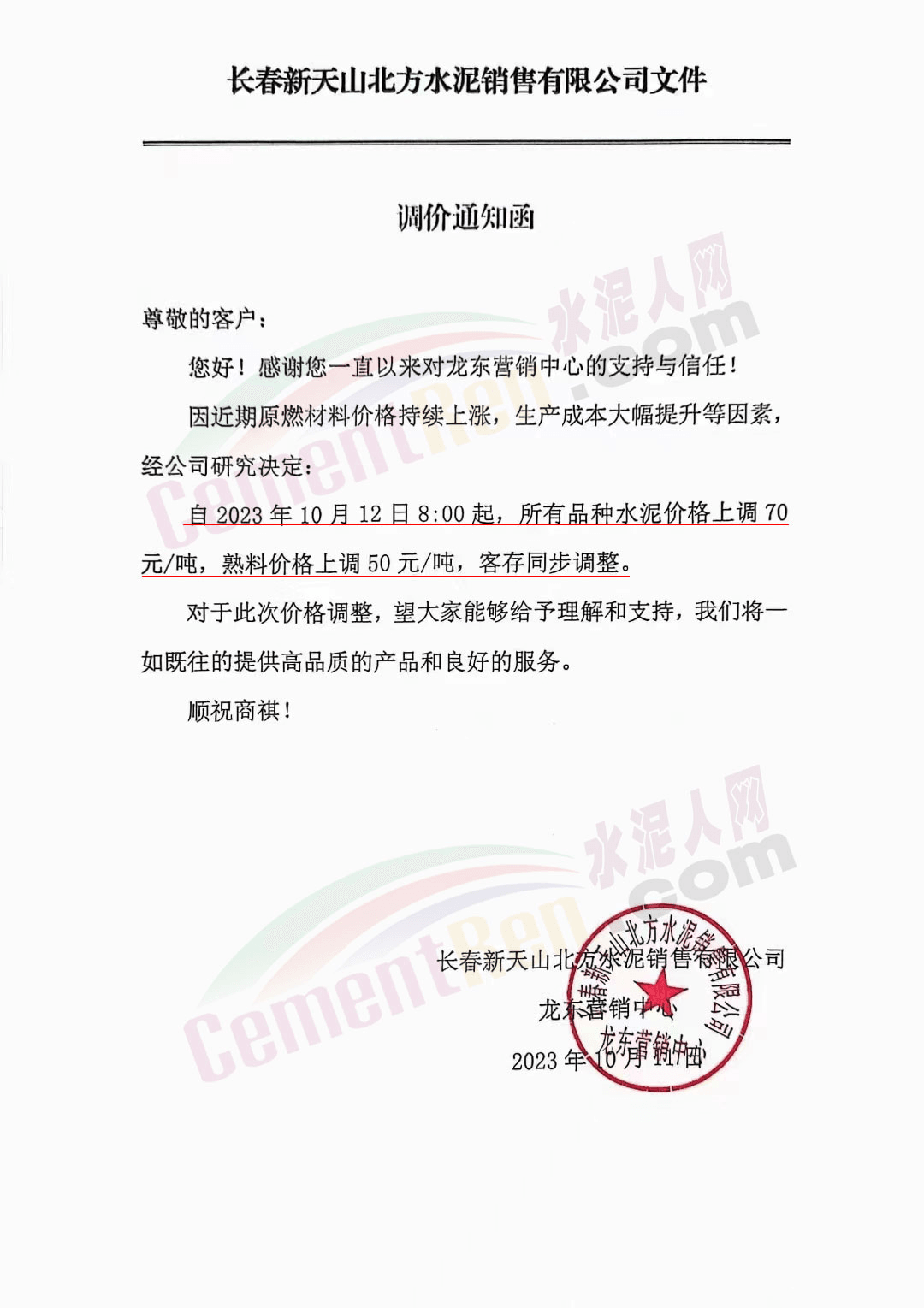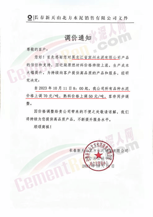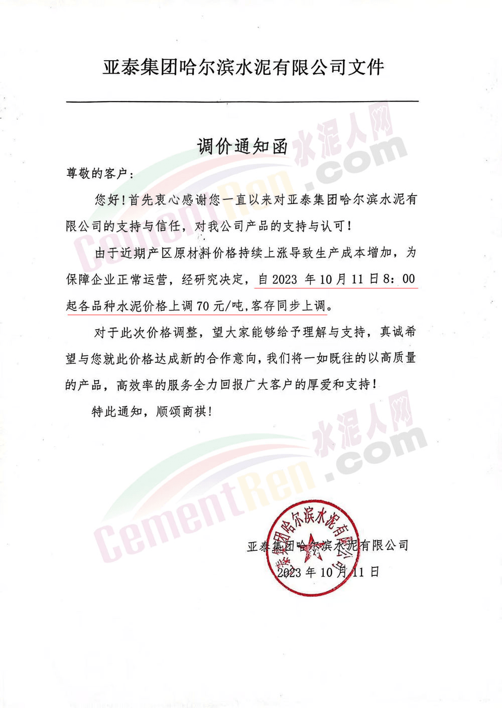 黑龍江區域主要品牌企業亞泰水泥、北方水泥以及遼寧金隅冀東發往黑龍江區域的水泥、熟料報價上調50-70元/噸。