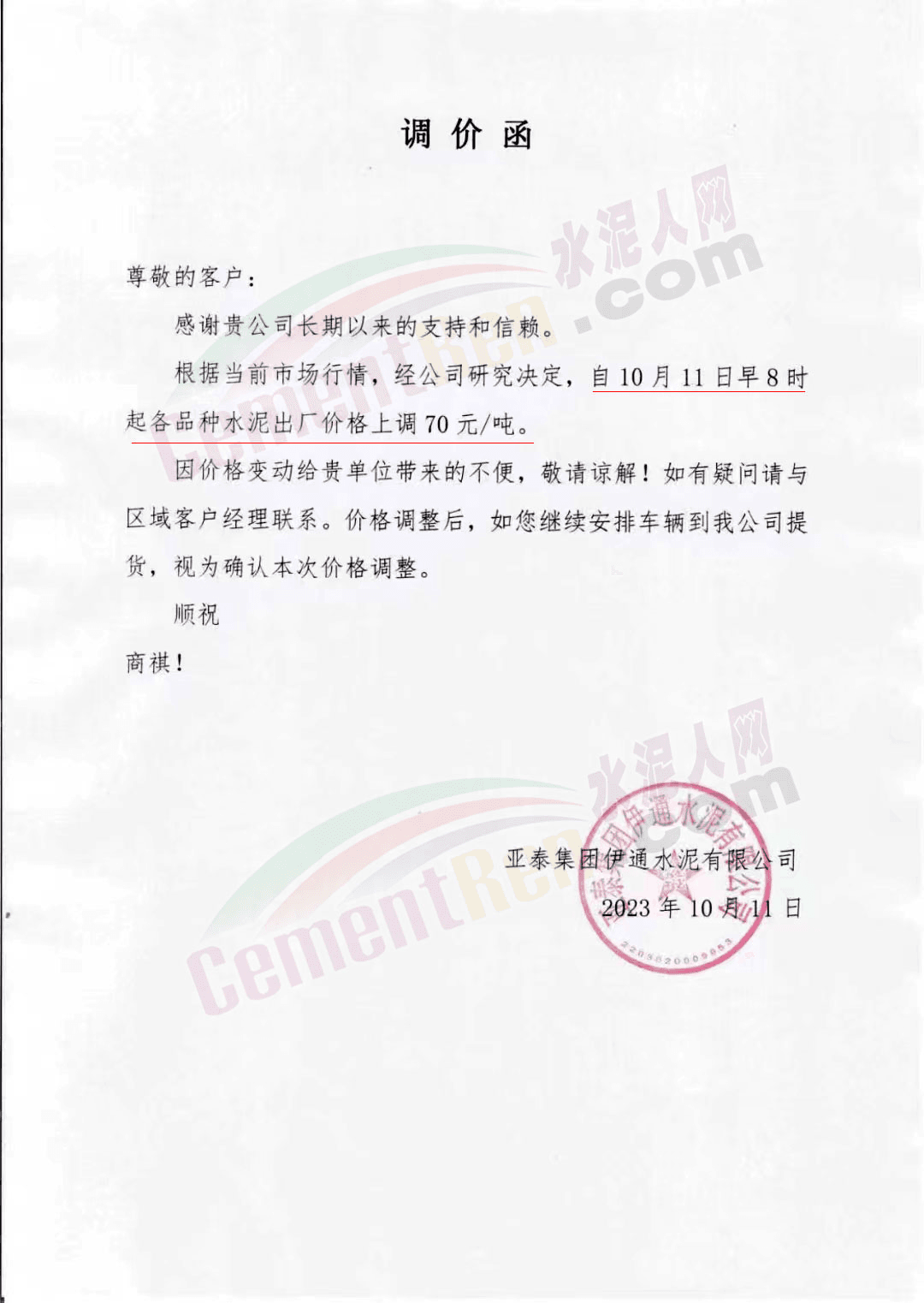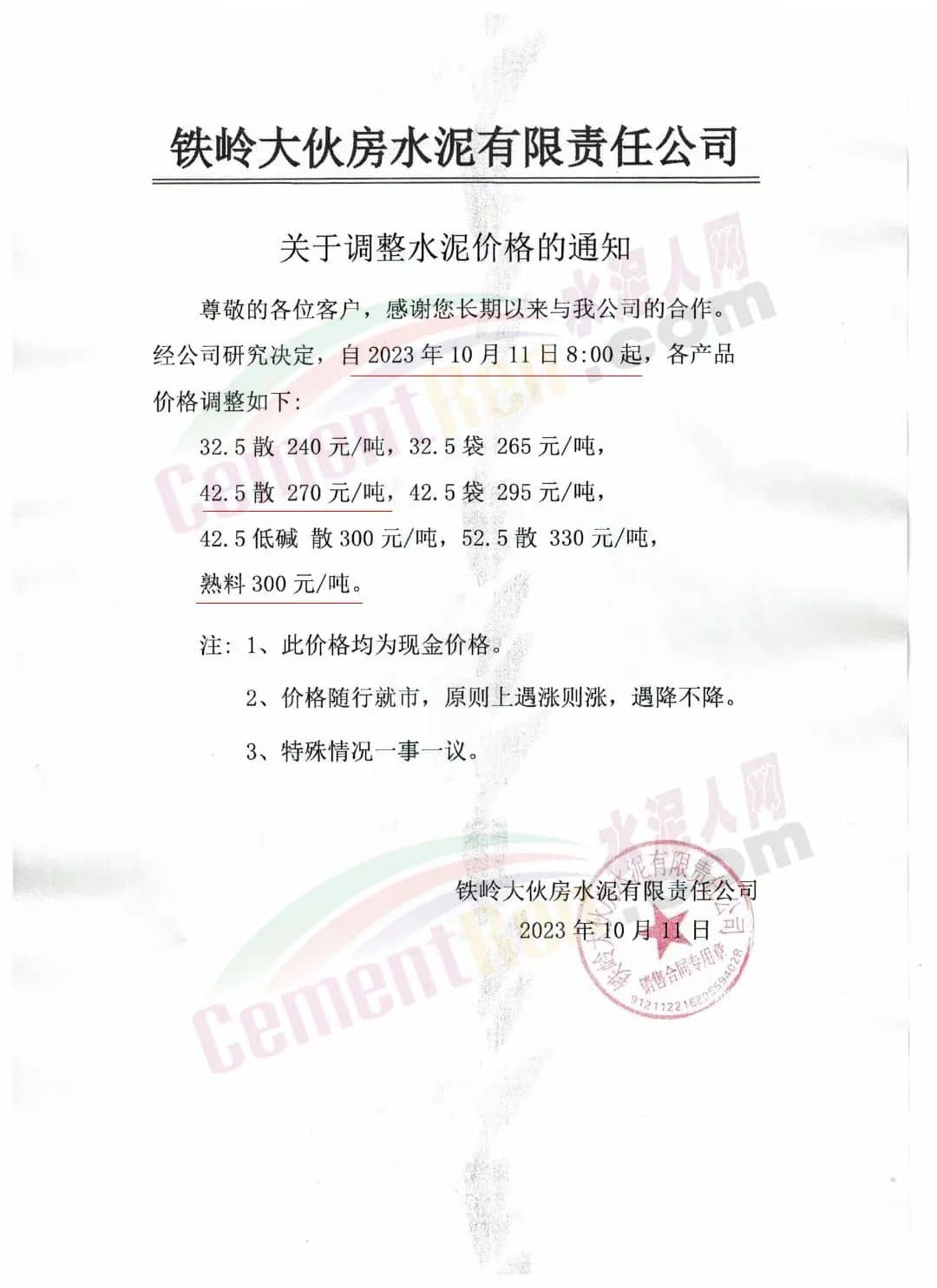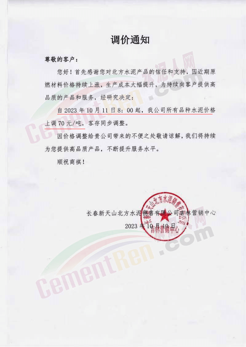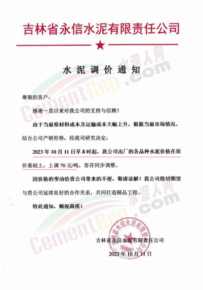 黑龍江區域主要品牌企業亞泰水泥、北方水泥以及遼寧金隅冀東發往黑龍江區域的水泥、熟料報價上調50-70元/噸。