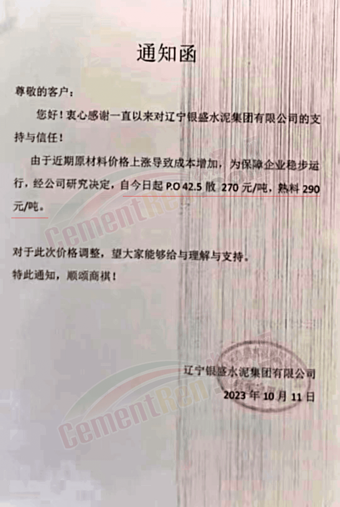 遼寧區域,吉林亞泰集團(遼寧)建材有限公司銷售分公司、天瑞水泥、山水工源、臺泥、銀盛、恒威、大伙房水泥等也通知調整水泥報價。調整后42.5級散裝水泥報價270元/噸,52.5散裝水泥報價330元/噸,熟料報價290~300元/噸。