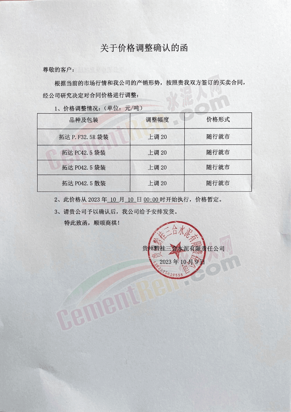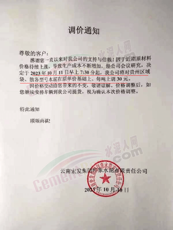 四川區域主要品牌水泥企業銷售經理通知,將于12日起上調水泥報價50元/噸。