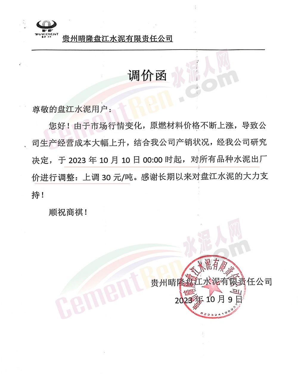 貴州區域多家企業通知上調水泥報價30元/噸。