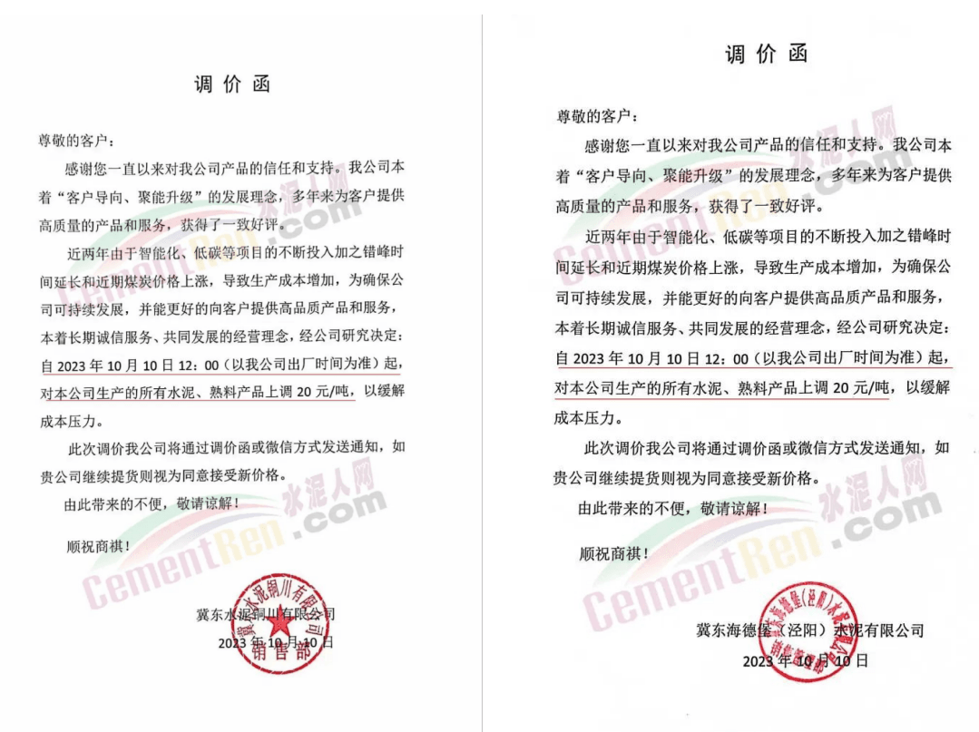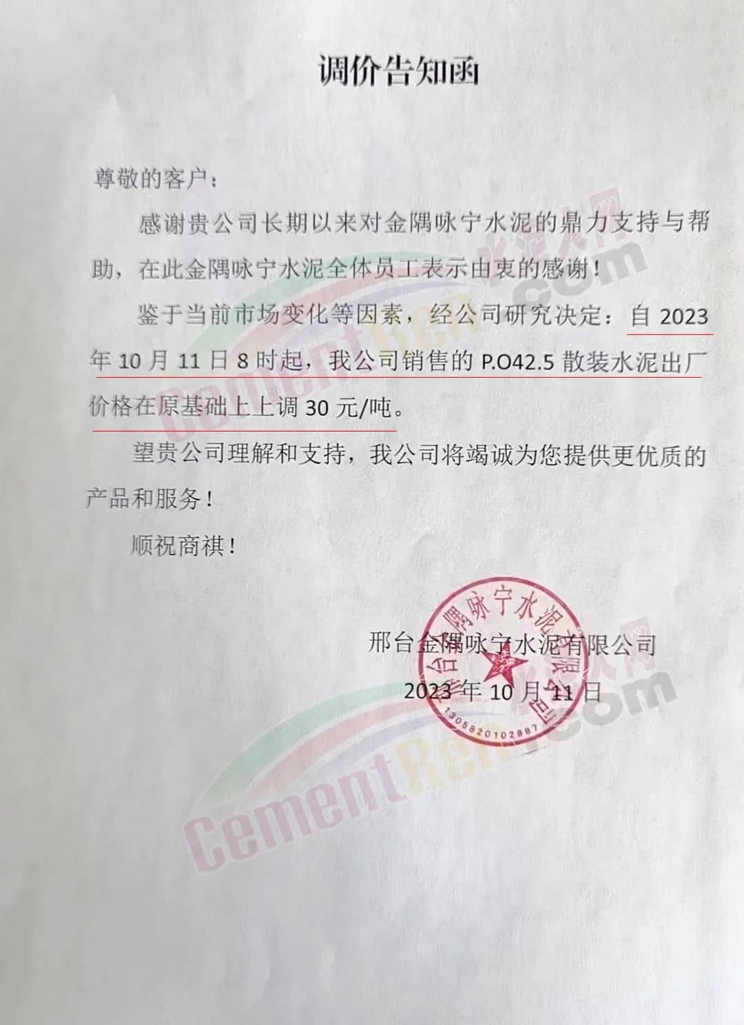 京津冀地區,北京金隅水泥石家莊分公司、邢臺金隅冀東水泥有限公司、邢臺金隅詠寧水泥有限公司等主要品牌企業通知上調水泥、熟料報價30元/噸。