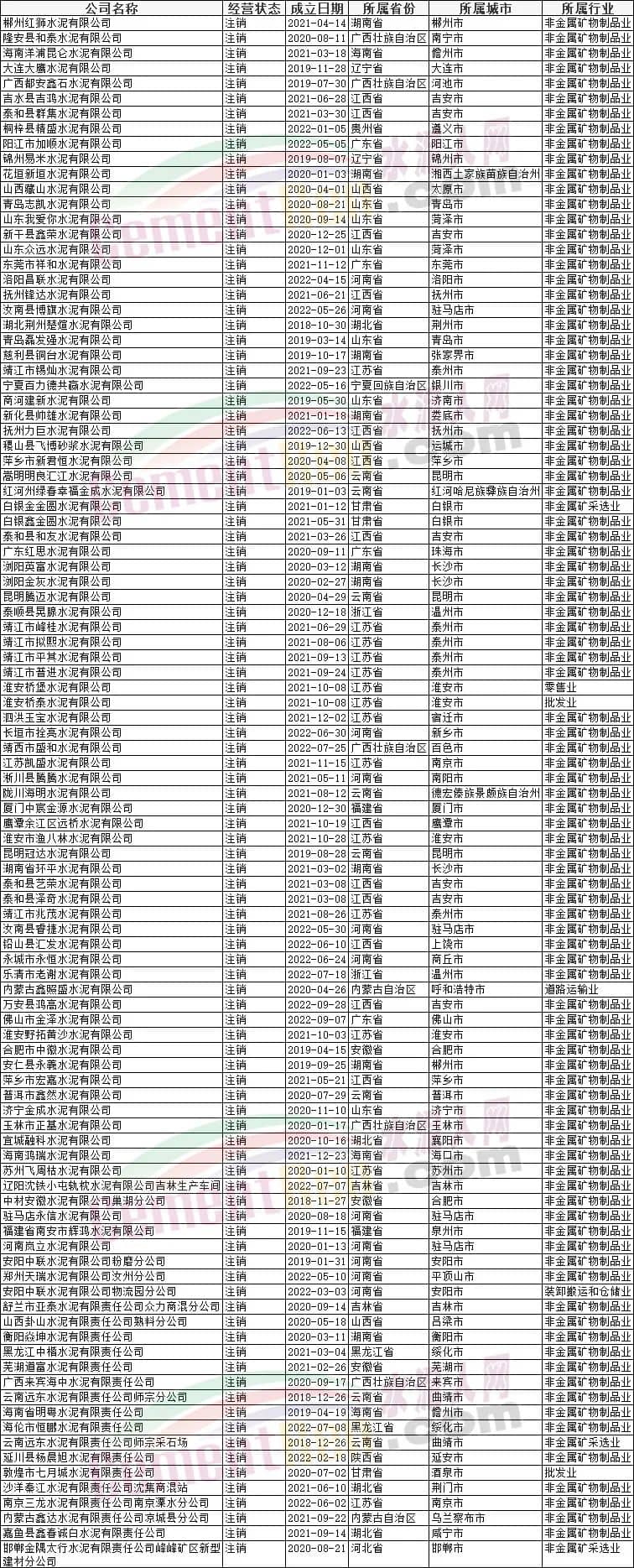 近5年成立,名稱中有“水泥有限公司、水泥有限責任公司”字樣,所屬行業為道路運輸業、非金屬礦采選業、非金屬礦物制品業、零售業、批發業、裝卸搬運和倉儲業,目前狀態是撤銷、吊銷、注銷的企業共102家。