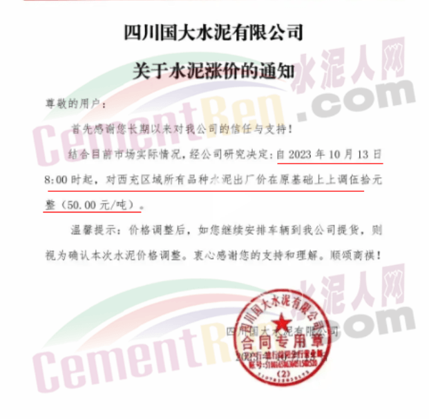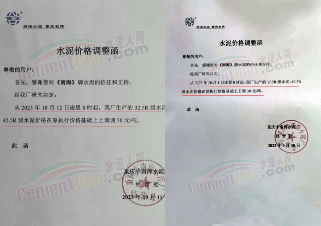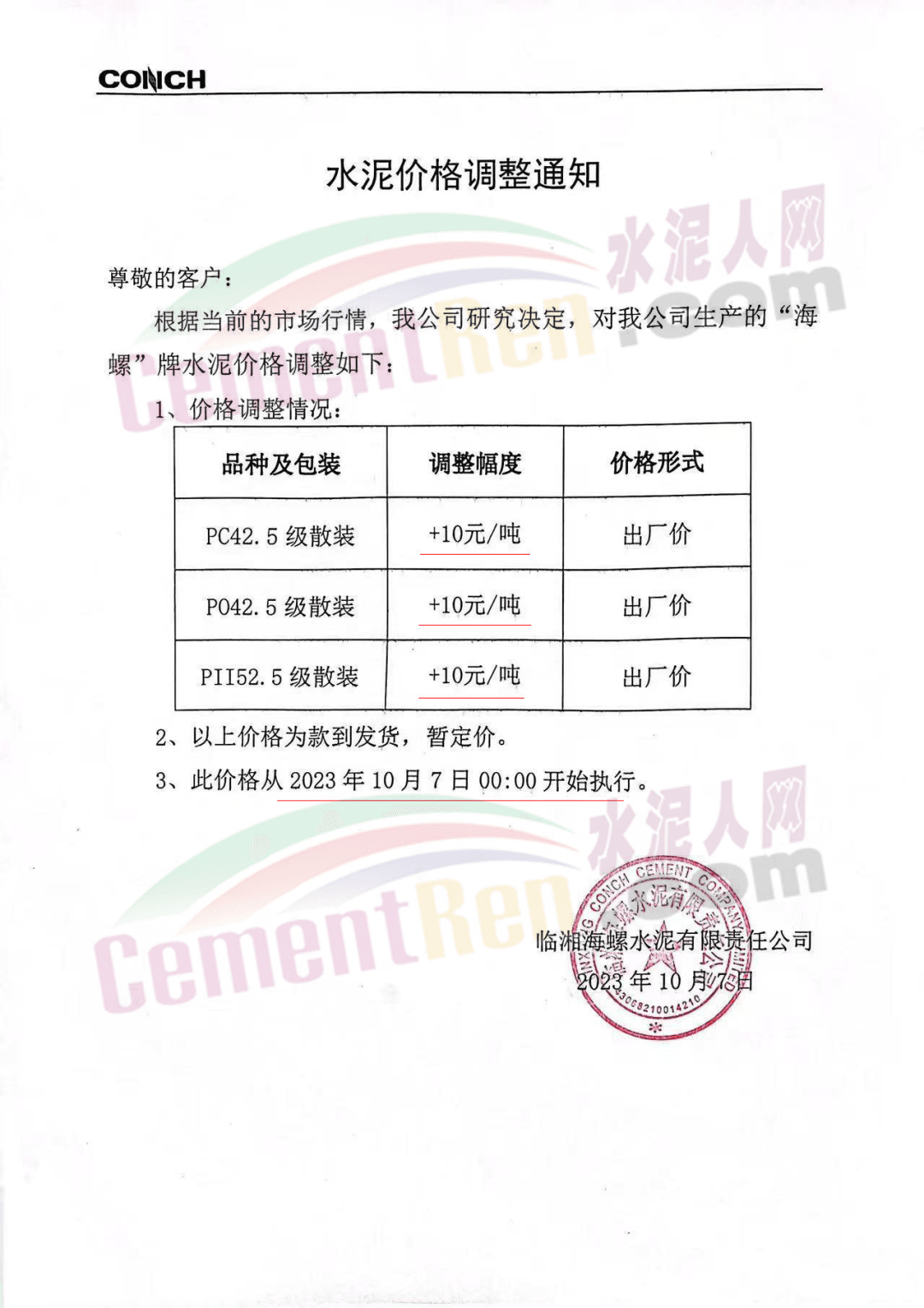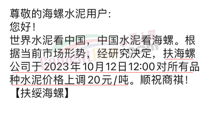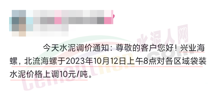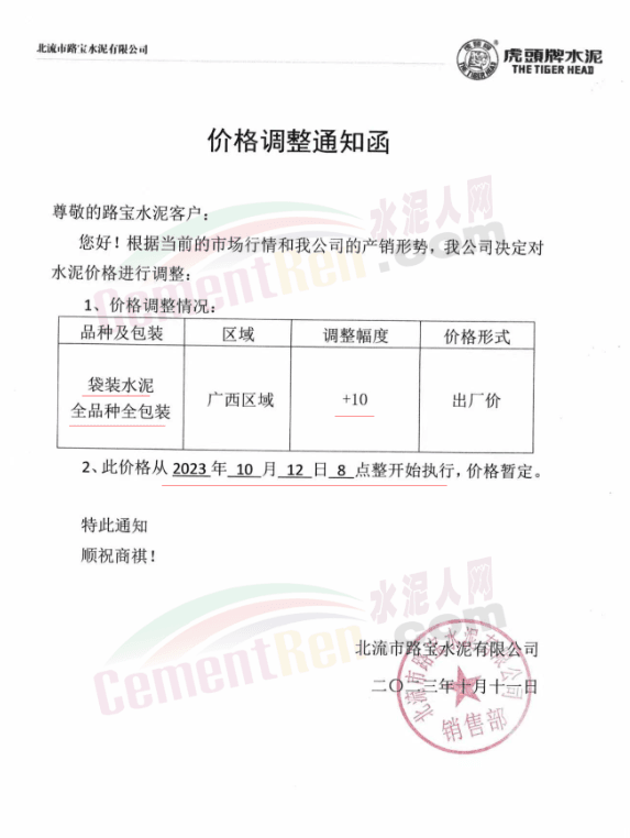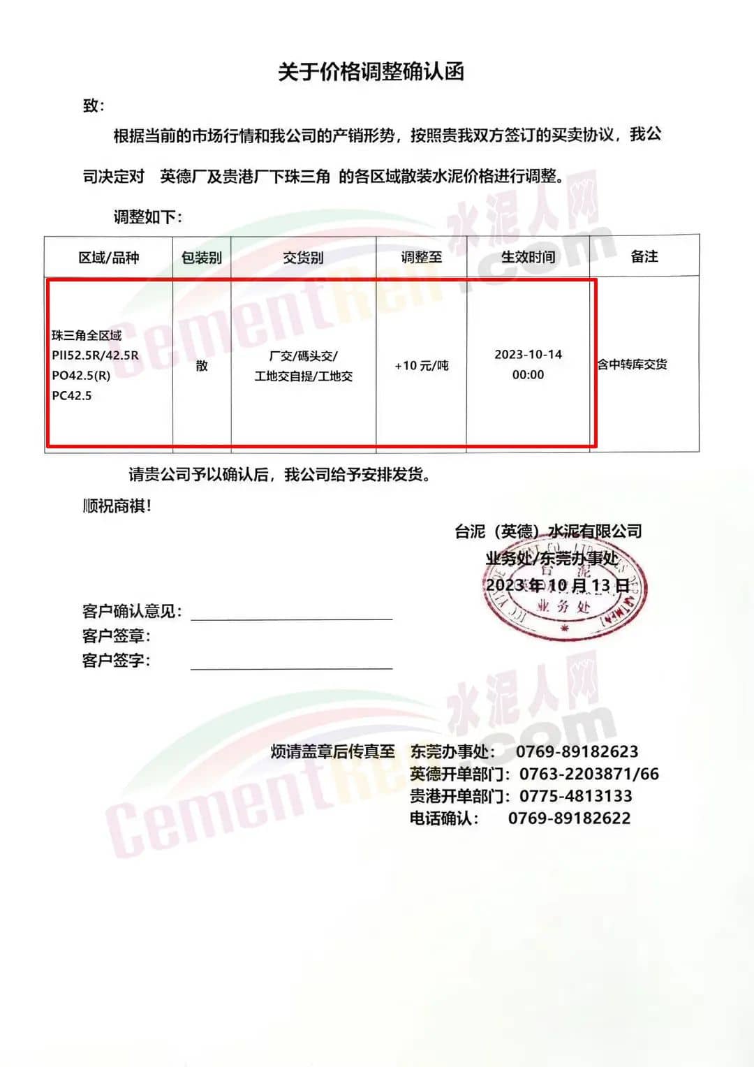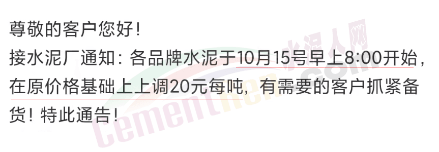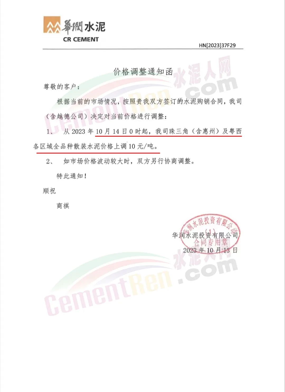 10月13日,廣東多區(qū)域經銷商收到通知,水泥價格將于14日起上調10元/噸。華潤水泥投資有限公司通知,自10月14日0時起,公司珠三角(含惠州)及粵西各區(qū)域全品種散裝水泥價格上調10元/噸。