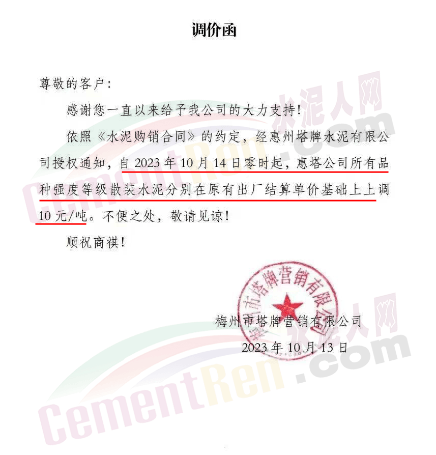 梅州市塔牌營銷有限公司通知,經惠州塔牌水泥有限公司授權通知,自2023年10月14日零時起,惠塔公司所有品種強度等級散裝水泥分別在原有出廠結算單價基礎上上調10元/噸。