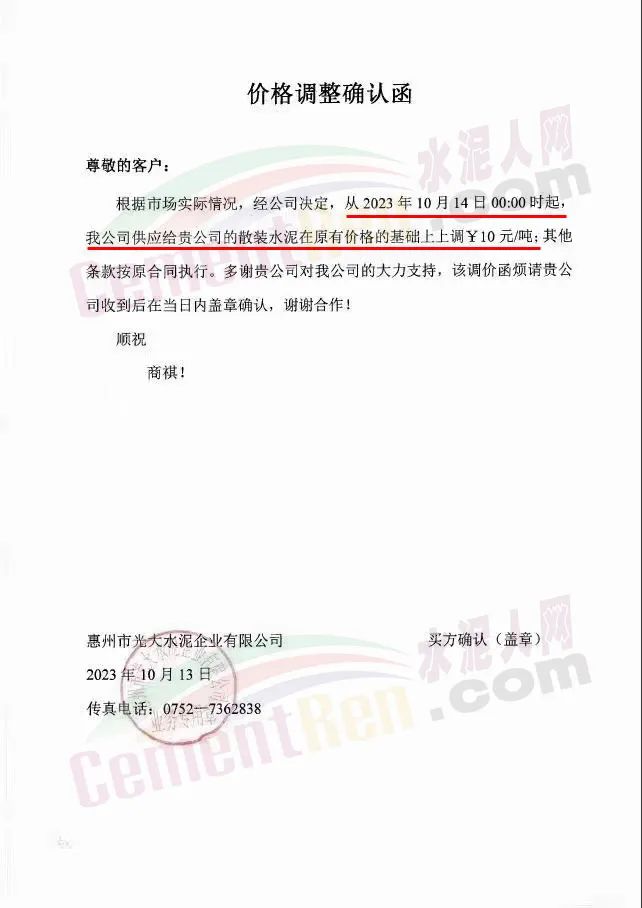 惠州光大水泥通知,14日0時起,散裝水泥在原價基礎上上調10元/噸。