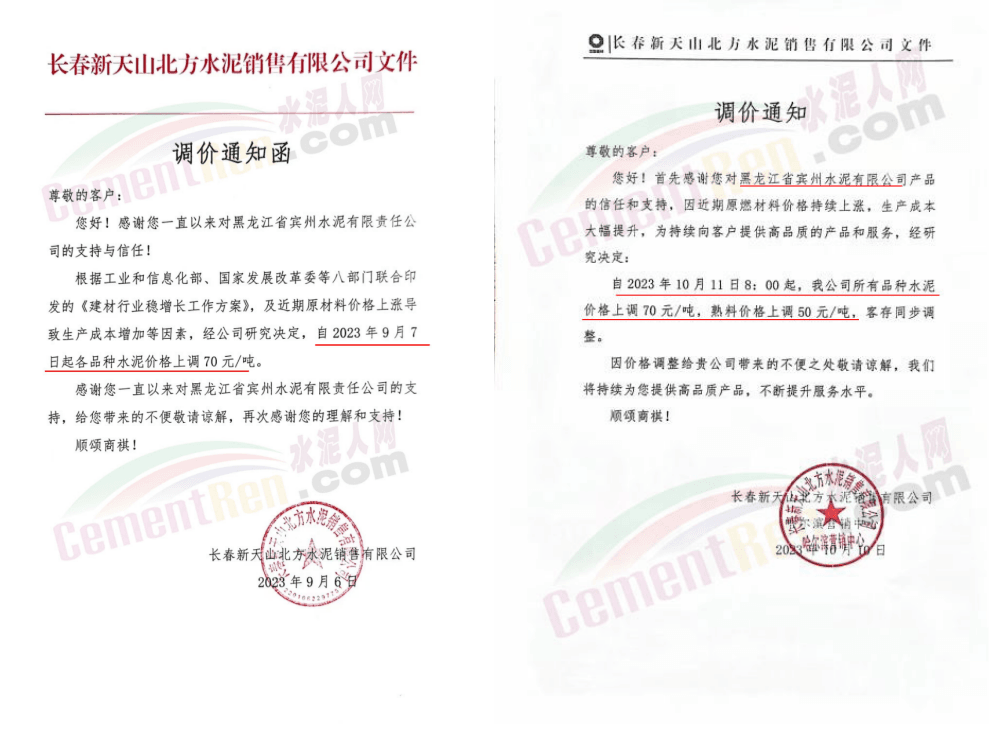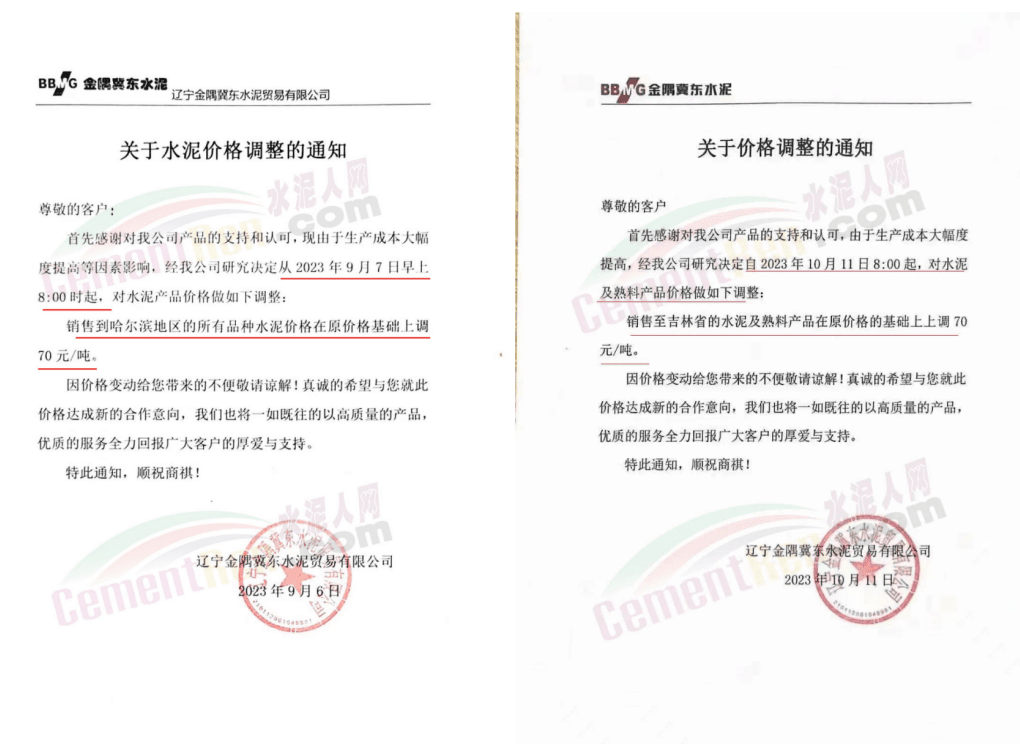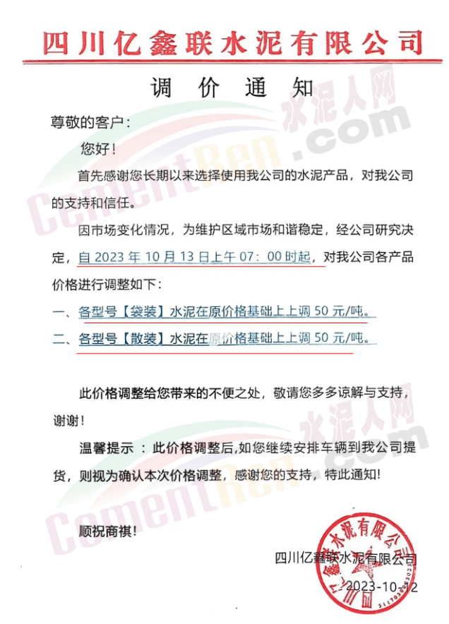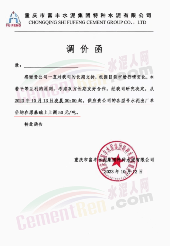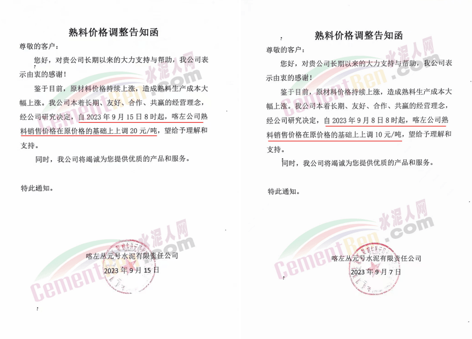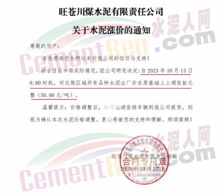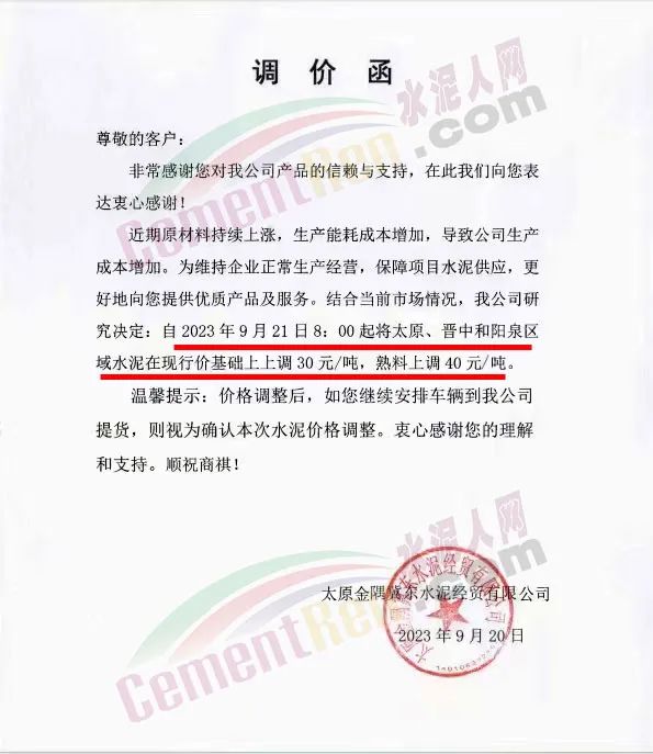 日前,山西太原金隅冀東水泥經貿有限公司通知稱,近期原材料持續(xù)上漲,生產能耗成本增加,導致公司生產成本增加。為維持企業(yè)正常生產經營,結合當前市場情況,公司研究決定,自2023年10月13日08:00起將左權公司全品種水泥在現行價基礎上上調50元/噸,熟料上調40元/噸。自12時起將陽泉、晉中太原區(qū)域PO425散裝水泥在現行價基礎上上調30元/噸,熟料上調40元/噸。