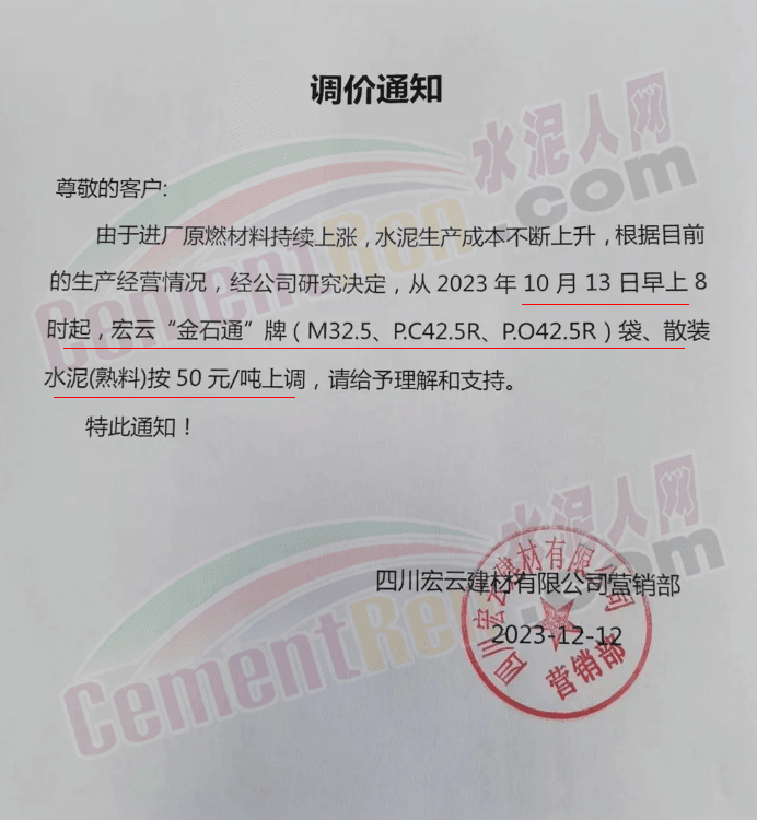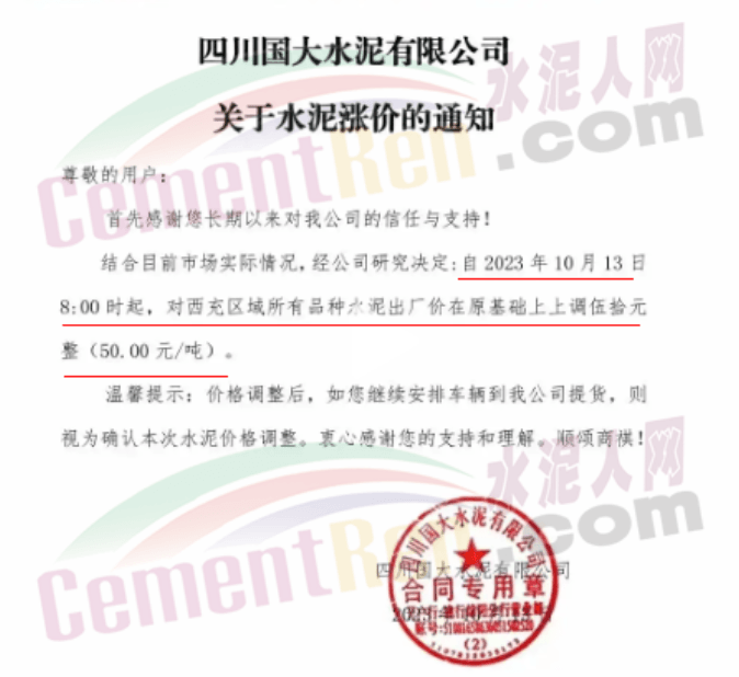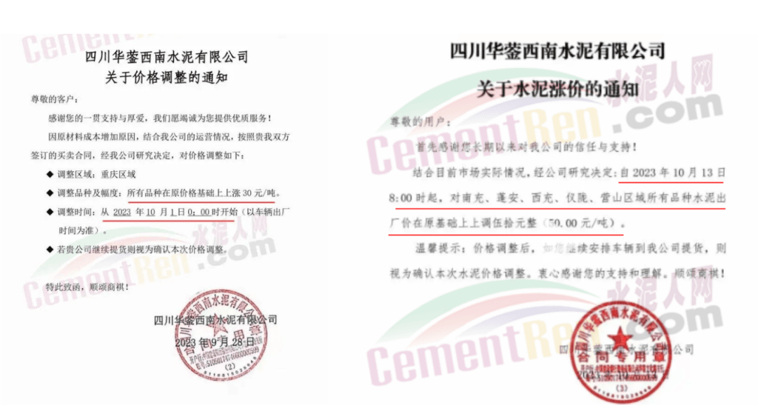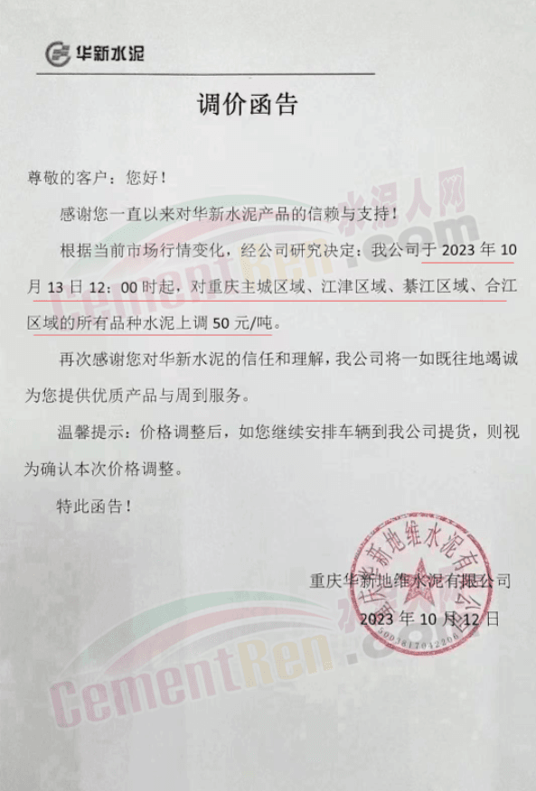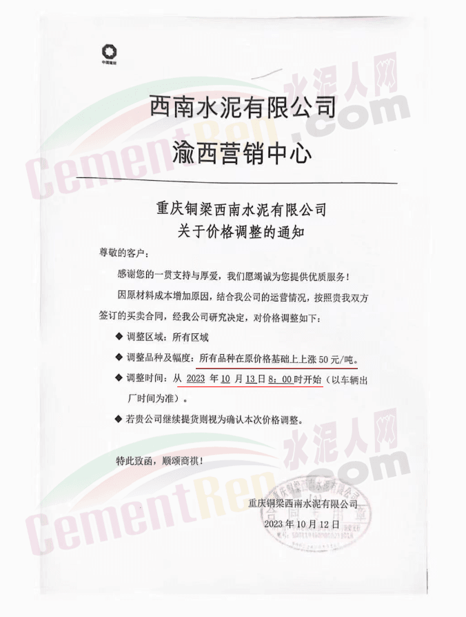 同日,川渝區(qū)域華新、西南、富豐、小南海等多家品牌水泥通知上調水泥報價50元/噸。