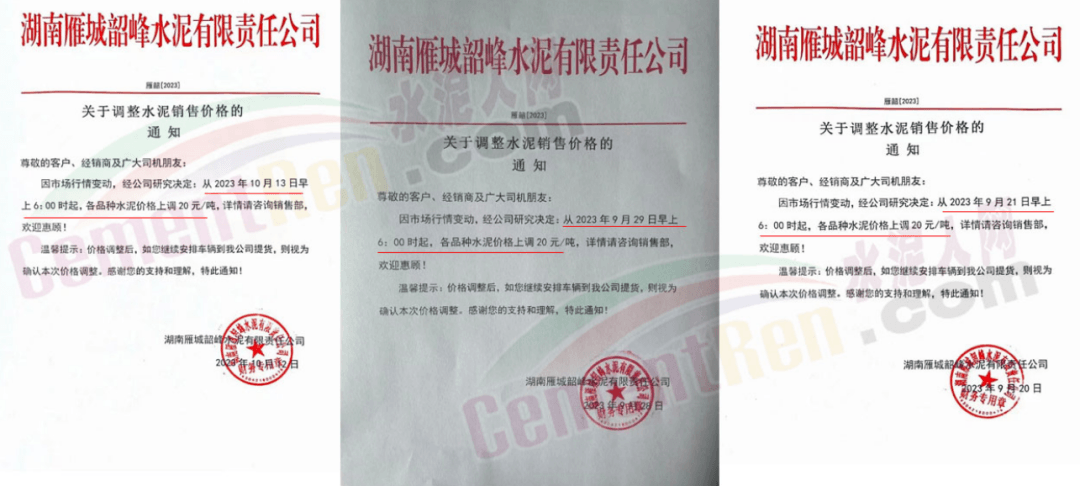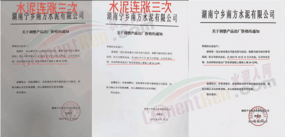 湖南寧鄉(xiāng)南方水泥有限公司分別于9月20日,9月28日,10月12日三次通知上調水泥報價各20元/噸,累計上調60元/噸。