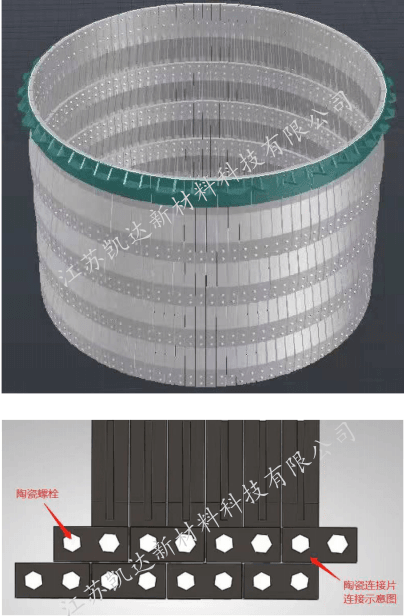 采用多種陶瓷復(fù)合材料,經(jīng)過1800℃左右高溫?zé)Y(jié)而成,使用溫度可達1500℃。具有耐高溫、抗沖刷、耐腐蝕、抗結(jié)皮、抗震性穩(wěn)定、重量輕、施工安裝方便。結(jié)構(gòu)上,掛片與底座采用特種高溫耐腐螺栓鏈接,耐熱鋼螺帽的外部采用碳化硅陶瓷保護套家耐火膠泥進行保護;底座與掛條之間加多晶棉,翻盤華處理,是安裝結(jié)構(gòu)更為合理;掛片底部采用陶瓷螺栓與陶瓷鏈接板進行雙鏈接,使其整合內(nèi)筒更加牢固。