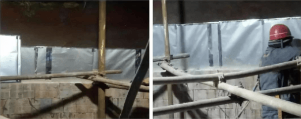 施工中,35mm納米隔熱板分兩層施工,一層25mm粘貼于鋼殼上,然后施工10mm的隔熱氈,兩層隔熱板錯縫施工。采用35mm納米隔熱板代替100mm的硅酸鈣板,內部直徑增加130mm,容積增加了32立方米,外殼溫度由原來的120℃下降到80℃,降溫幅度為40℃,擴容和節能效果明顯,同時50天就收回了投資。